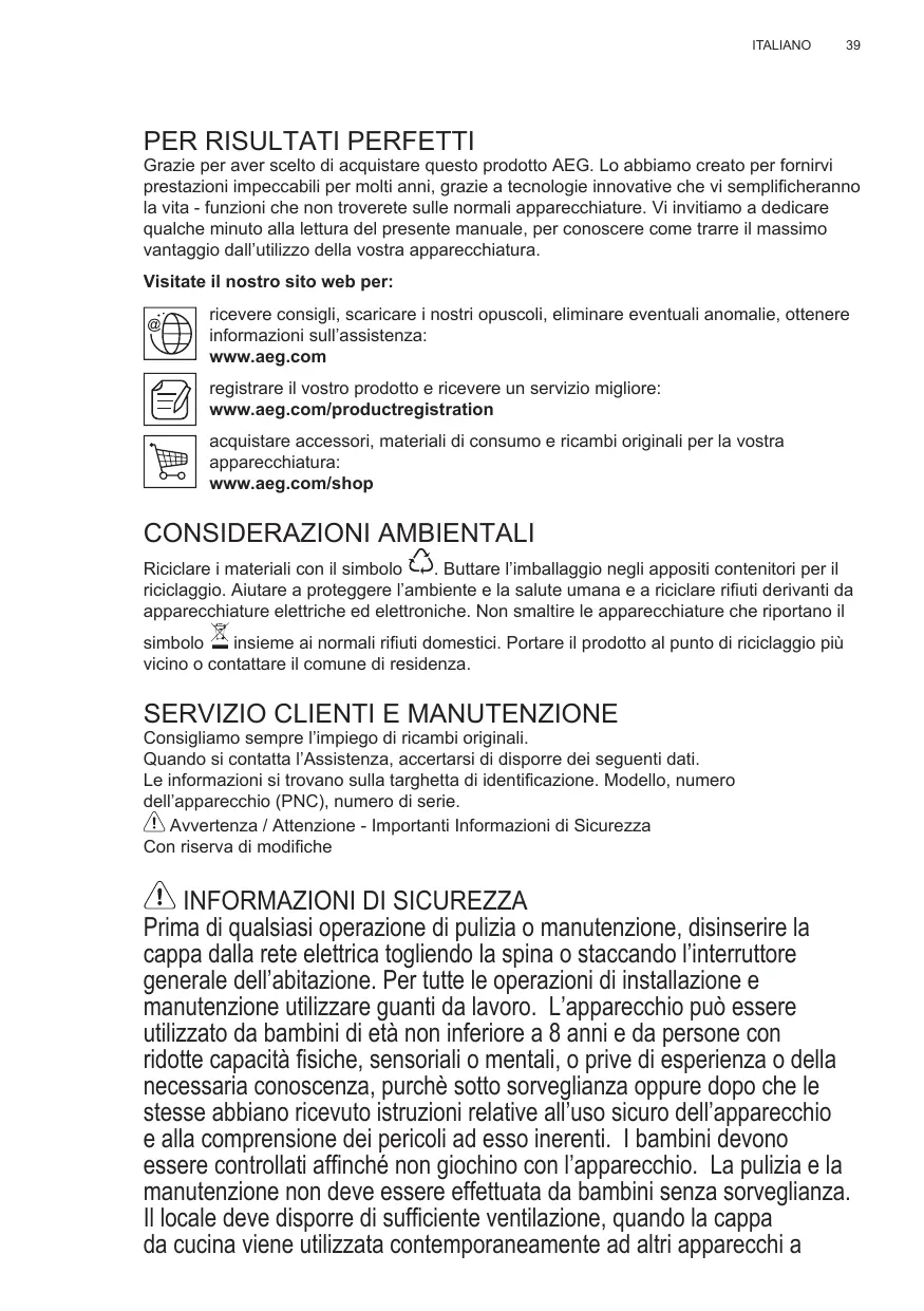 Grazie per aver scelto di acquistare questo prodotto AEG. Lo abbiamo creato per fornirvi prestazioni impeccabili per molti anni, grazie a tecnologie innovative che vi semplificheranno la vita - funzioni che non troverete sulle normali apparecchiature. Vi invitiamo a dedicare qualche minuto alla lettura del presente manuale, per conoscere come trarre il massimo vantaggio dall’utilizzo della vostra apparecchiatura. Visitate il nostro sito web per: ricevere consigli, scaricare i nostri opuscoli, eliminare eventuali anomalie, ottenere informazioni sull’assistenza: www.aeg.com registrare il vostro prodotto e ricevere un servizio migliore: www.aeg.com/productregistration acquistare accessori, materiali di consumo e ricambi originali per la vostra apparecchiatura: www.aeg.com/shop CONSIDERAZIONI AMBIENTALI Riciclare i materiali con il simbolo . Buttare l’imballaggio negli appositi contenitori per il riciclaggio. Aiutare a proteggere l’ambiente e la salute umana e a riciclare rifiuti derivanti da apparecchiature elettriche ed elettroniche. Non smaltire le apparecchiature che riportano il simbolo insieme ai normali rifiuti domestici. Portare il prodotto al punto di riciclaggio più vicino o contattare il comune di residenza.