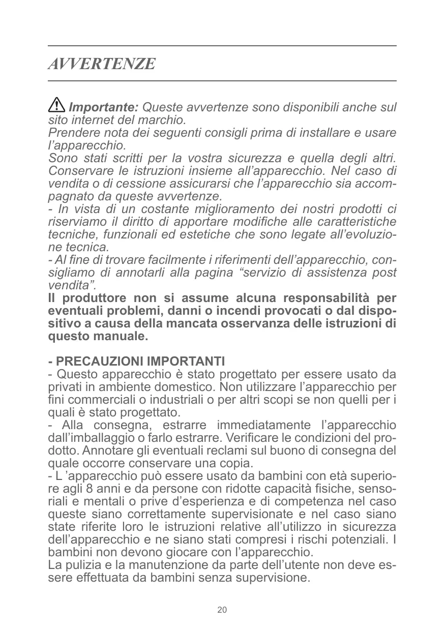 - Dans le souci d’une amélioration constante de nos produits, nous réservons le droit d’apporter à leurs caractéristiques techniques, fonctionnelles ou esthétiques toutes modifications de leurs caractéristiques liées à l’évolution technique. - Afin de retrouver aisément les références (1.0) de votre appareil, nous vous conseillons de les noter en page “Service et Relations Consommateurs”. Le constructeur décline toute responsabilité pour tous les inconvénients, dommages ou incendies provoqués sur et par l’appareil et dus à la non observation des instructions de la présente notice. - PRÉCAUTIONS IMPORTANTES - Cet appareil a été conçu pour être utilisé par des particuliers dans leur lieu d’habitation. Ne l’utilisez pas à des fins commerciales ou industrielles ou pour d’autres buts que celui pour lequel il a été conçu. - A la réception de l’appareil, déballez-le ou faites le déballer immédiatement. Vérifiez son aspect général. Faites les éventuelles réserves par écrit sur le bon de livraison dont vous gardez un exemplaire. - Cet appareil peut être utilisé par des enfants d’au moins 8 ans et par des personnes ayant des capacités physiques, sensorielles, ou mentales réduites ou dénuées d’expérience ou de connaissance, s’ils (si elles) sont correctement surveillé(e)s ou si des instructions relatives à l’utilisation de l’appareil en toute sécurité leur ont été données et si les risques encourus ont été appréhendés. Les enfants ne doivent pas jouer avec l’appareil. Le nettoyage et l’entretien ne doivent pas être effectués par les enfants sans surveillance. 8