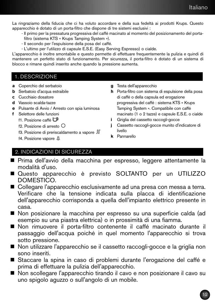 - L’un pour le tassage progressif de la mouture lors du positionnement du porte-filtre (système KTS « Krups Tamping System »). - L’autre pour l’éjection du marc. - Le dernier pour l’utilisation de dosettes E.S.E. (Easy Serving Espresso) ou souples. Il est en outre démontable, ce qui permet de le maintenir, par des nettoyages fréquents, en parfait état de fonctionnement. Par sécurité, votre porte-filtre est équipé d’un système de verrouillage pour qu’il reste en place lors de la montée en pression.