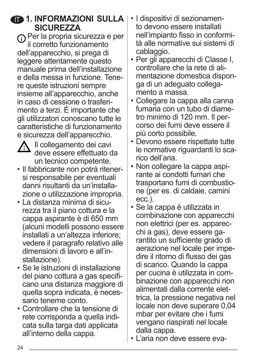 Toujours conserver ces instructions avec l’appareil, même en cas de cession ou de transfert à une autre personne. Il est important que les utilisateurs connaissent toutes les caractéristiques de fonctionnement et de sécurité de l’appareil. La connexion des câbles doit être effectuée par un technicien compétent. • En aucun cas le fabricant ne peut être tenu pour responsable d’éventuels dommages dus à une installation ou à une utilisation impropre. • La distance de sécurité minimum entre le plan de cuisson et la hotte aspirante est de 650 mm (certains modèles peuvent être installés à une hauteur inférieure ; voir le paragraphe concernant les dimensions de travail et l’installation). • Si les instructions