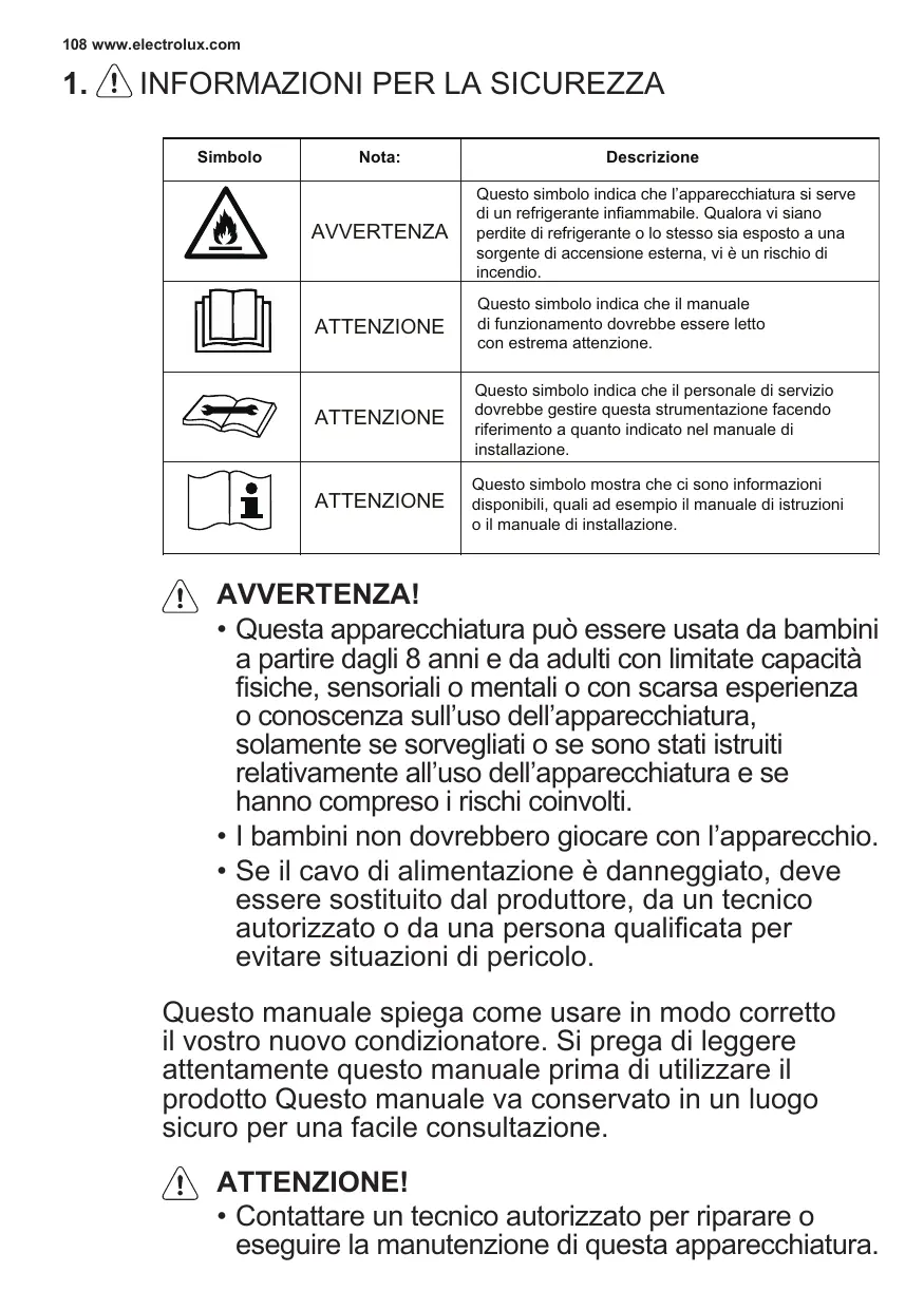 AVVERTENZA! Avvertenze in fase di utilizzo 116 www.electrolux.com Avvertenza Significato Inserire correttamente la spina nella presa In caso contrario, c’è il pericolo di scosse elettriche, incendi o esplosioni dovuti all’eccessiva produzione di calore Non azionare o spegnere l’apparecchiatura inserendo o estraendo la spina di alimentazione Diversamente si potrebbero provocare scosse elettriche, fuoco ed esplosioni data la generazione di calore Non danneggiare o utilizzare un cavo di alimentazione non idoneo Diversamente si potrebbero provocare scosse elettriche, fuoco ed esplosioni. Se il cavo di alimentazione è danneggiato, deve essere sostituito dal fabbricante, da un centro di assistenza autorizzato o una persona qualificata per evitare pericoli. Non modificare la lunghezza del cavo elettrico o utilizzare prese multiple Diversamente si potrebbero provocare scosse elettriche, fuoco ed esplosioni data la generazione di calore Non azionare l’unità con mani bagnate o in un ambiente umido Può essere causa di scosse elettriche Non dirigere il flusso dell’aria sulle persone Ciò può essere dannoso per la salute Garantire sempre una corretta messa a terra La messa a terra inadeguata può essere causa di scosse elettriche Non fare entrare acqua nelle parti elettriche Può essere causa di danni all’apparecchiatura o scosse elettriche Installare sempre un disgiuntore e un circuito dedicato Un’installazione errata potrebbe causare scosse elettriche, fuoco ed esplosioni Scollegare l’alimentazione se si percepiscono rumori anomali, odori particolari o se del fumo esce dall’apparecchiatura Diversamente si potrebbero provocare scosse elettriche, fuoco ed esplosioni Non collegare la spina se è allentata o danneggiata Diversamente si potrebbero provocare scosse elettriche, fuoco ed esplosioni Non aprire l’apparecchiatura durante il funzionamento Diversamente si potrebbero provocare scosse elettriche, fuoco ed esplosioni Tenere le armi lontane Potrebbe causare incendi o esplosione Non utilizzare il cavo di alimentazione vicino ad apparecchi di riscaldamento Diversamente si potrebbero provocare scosse elettriche, fuoco ed esplosioni Non lasciare il cavo elettrico vicino a gas Diversamente si potrebbero provocare infiammabili o combustibili, quali benzina, scosse elettriche, fuoco ed esplosioni benzene, diluente ecc. Aerare l’ambiente prima di azionare il Pericolo di incendio, esplosione condizionatore qualora si sia verificata una e bruciature fuga di gas da un’altra apparecchiatura Non smontare o modificare l’apparecchiatura Pericolo di guasto e scosse elettriche ITALIANO