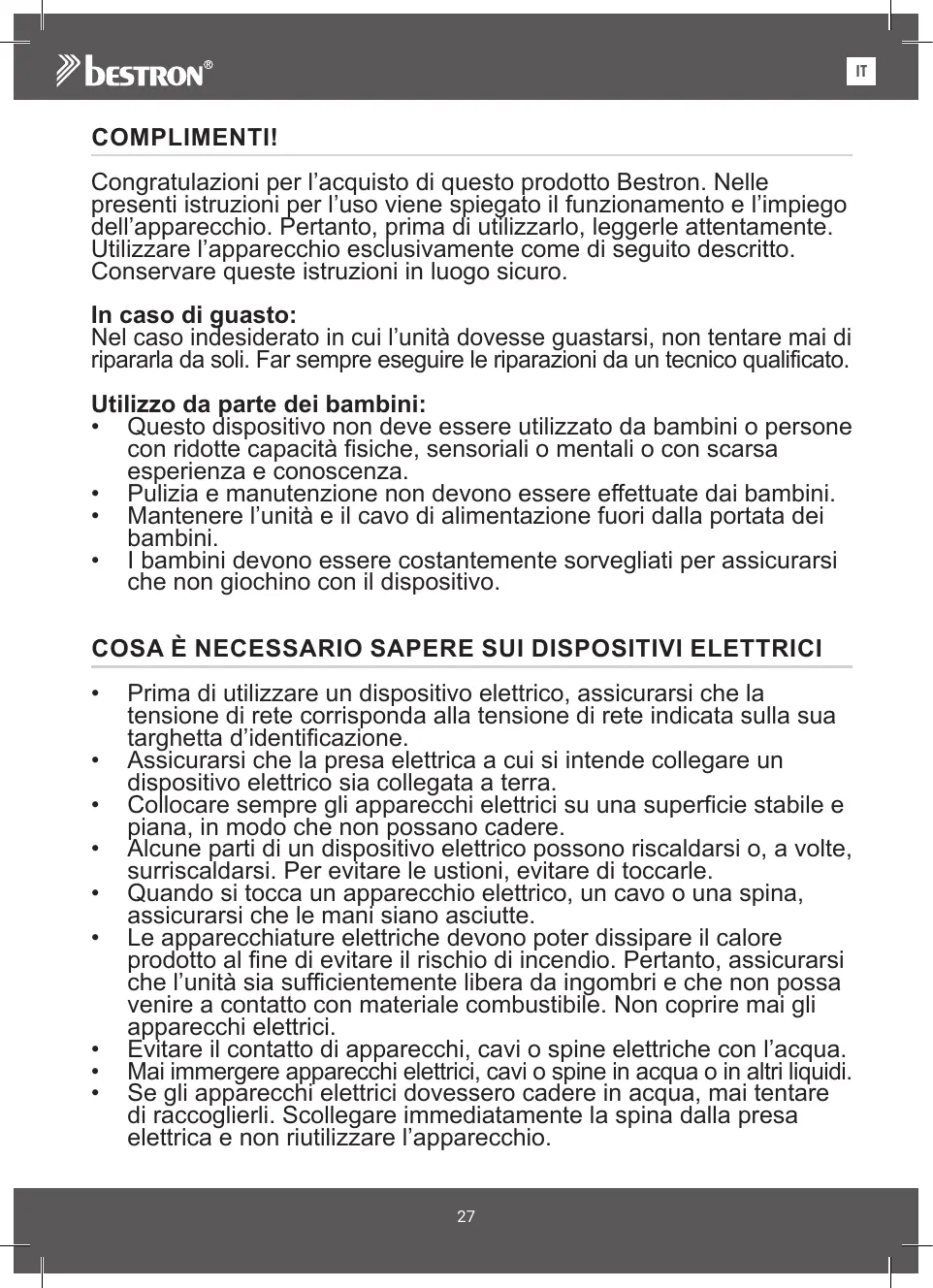 IT COMPLIMENTI! Congratulazioni per l’acquisto di questo prodotto Bestron. Nelle presenti istruzioni per l’uso viene spiegato il funzionamento e l’impiego dell’apparecchio. Pertanto, prima di utilizzarlo, leggerle attentamente. Utilizzare l’apparecchio esclusivamente come di seguito descritto. Conservare queste istruzioni in luogo sicuro. In caso di guasto: Nel caso indesiderato in cui l’unità dovesse guastarsi, non tentare mai di ripararla da soli. Far sempre eseguire le riparazioni da un tecnico qualificato. Utilizzo da parte dei bambini: • Questo dispositivo non deve essere utilizzato da bambini o persone con ridotte capacità fisiche, sensoriali o mentali o con scarsa esperienza e conoscenza. • Pulizia e manutenzione non devono essere effettuate dai bambini. • Mantenere l’unità e il cavo di alimentazione fuori dalla portata dei bambini. • I bambini devono essere costantemente sorvegliati per assicurarsi che non giochino con il dispositivo. COSA È NECESSARIO SAPERE SUI DISPOSITIVI ELETTRICI • • • • • •
