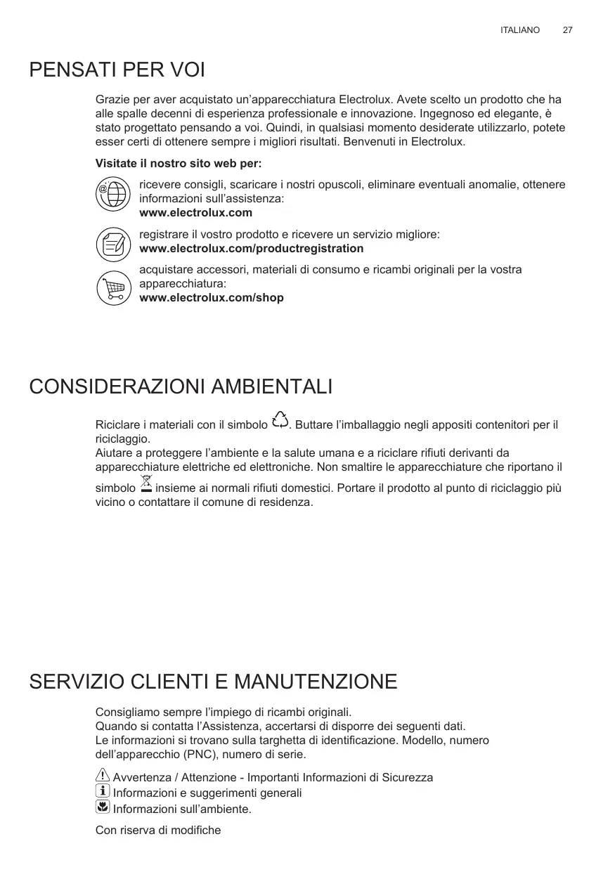 Grazie per aver acquistato un’apparecchiatura Electrolux. Avete scelto un prodotto che ha alle spalle decenni di esperienza professionale e innovazione. Ingegnoso ed elegante, è stato progettato pensando a voi. Quindi, in qualsiasi momento desiderate utilizzarlo, potete esser certi di ottenere sempre i migliori risultati. Benvenuti in Electrolux. Visitate il nostro sito web per: ricevere consigli, scaricare i nostri opuscoli, eliminare eventuali anomalie, ottenere informazioni sull’assistenza: www.electrolux.com registrare il vostro prodotto e ricevere un servizio migliore: www.electrolux.com/productregistration acquistare accessori, materiali di consumo e ricambi originali per la vostra apparecchiatura: www.electrolux.com/shop CONSIDERAZIONI AMBIENTALI Riciclare i materiali con il simbolo . Buttare l’imballaggio negli appositi contenitori per il riciclaggio. Aiutare a proteggere l’ambiente e la salute umana e a riciclare rifiuti derivanti da apparecchiature elettriche ed elettroniche. Non smaltire le apparecchiature che riportano il simbolo insieme ai normali rifiuti domestici. Portare il prodotto al punto di riciclaggio più vicino o contattare il comune di residenza.