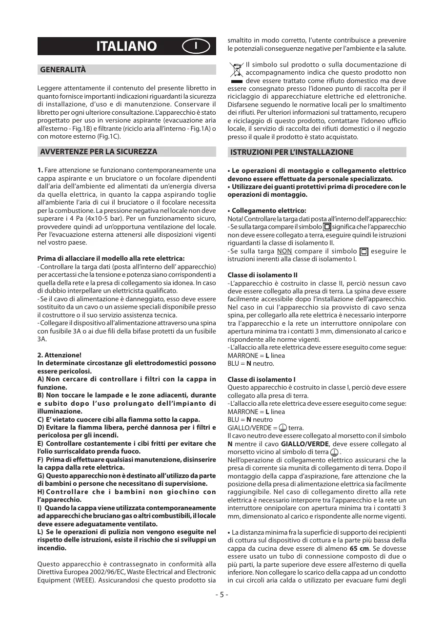 C) Il est absolument interdit de flamber sous la hotte. D)Évitez de laisser des flammes libres, elles sont dangereuses pour les filtres et pour les risques d’incendie. E) Surveillez constamment les fritures pour éviter que l’huile surchauffée prenne feu. F) Avant de procéder à toute opération d’entretien, coupez l’alimentation électrique de la hotte. G)Cet appareil ne peut pas être utilisé par des enfants ou par des personnes nécessitant une surveillance. H) Veillez à ce que les enfants ne jouent pas avec l’appareil. I) Lorsque la hotte est utilisée en présence d’appareils utilisant du gaz ou d’autres combustibles, la pièce doit être correctement ventilée. L) Si le nettoyage n’est pas réalisé conformément aux instructions, un incendie peut se déclarer. Cet appareil est marqué conformément à la Directive européenne 2002/96/CE sur les déchets d’équipements électriques et électroniques (DEEE). Assurez-vous que cet appareil soit mis au rebus selon la réglementation en vigueur, vous éviterez ainsi des conséquences néfastes sur l’environnement et la santé. Le symbole appliqué sur le produit ou sur la documentation jointe rappelle que cet appareil ne doit pas être traité comme un déchet domestique mais faire l’objet d’une collecte sélective dans une déchetterie spécialisée dans le recyclage des appareils électriques et électroniques. Conformez-vous aux réglementations locales sur la collecte et l’élimination des déchets. Pour tout autre renseignement sur le traitement, la récupération et le recyclage de cet appareil, veuillez contacter le bureau concerné de votre ville, le service de collecte des déchets domestiques ou le magasin où vous avez acheté votre appareil.
