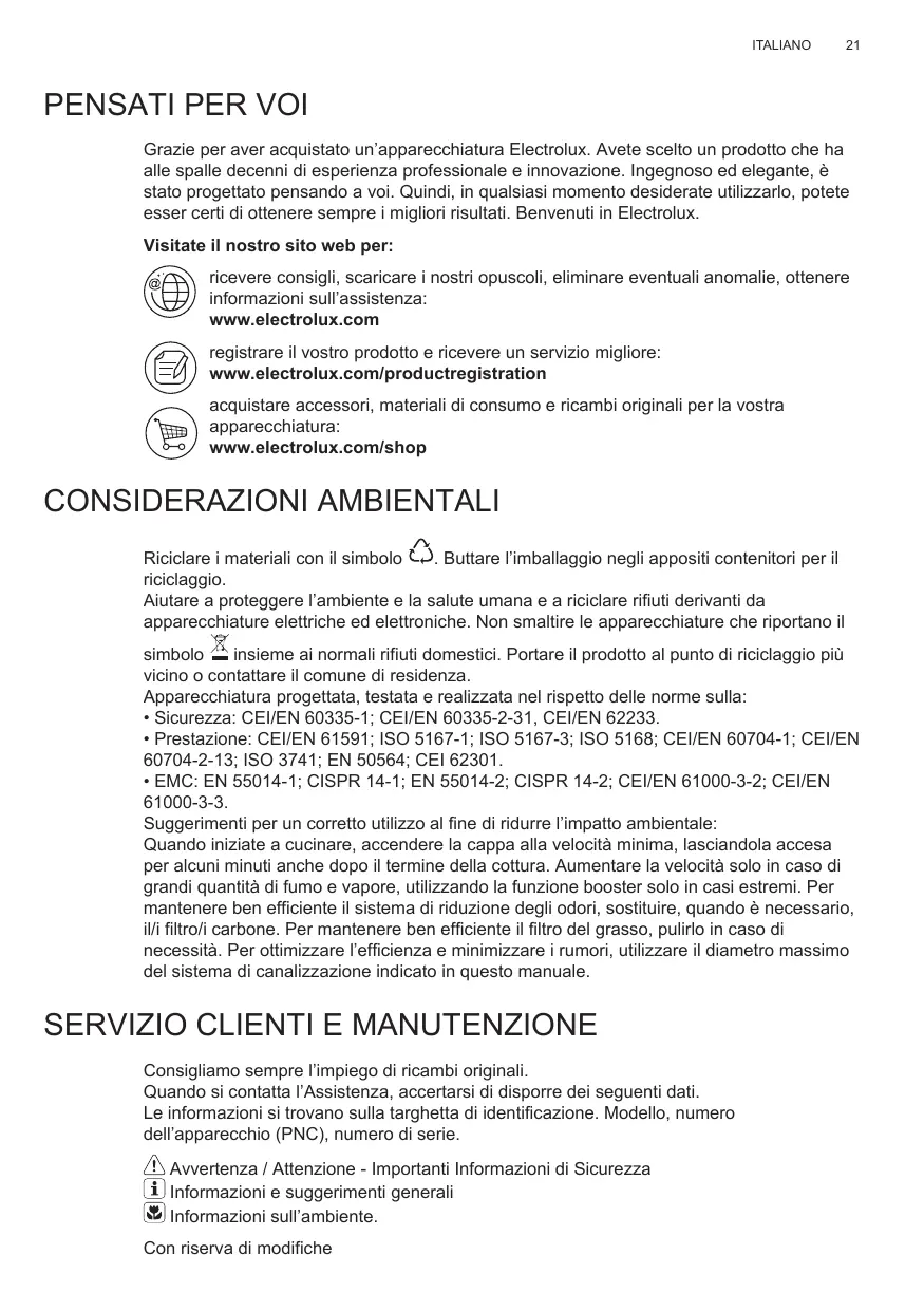 Grazie per aver acquistato un’apparecchiatura Electrolux. Avete scelto un prodotto che ha alle spalle decenni di esperienza professionale e innovazione. Ingegnoso ed elegante, è stato progettato pensando a voi. Quindi, in qualsiasi momento desiderate utilizzarlo, potete esser certi di ottenere sempre i migliori risultati. Benvenuti in Electrolux. Visitate il nostro sito web per: ricevere consigli, scaricare i nostri opuscoli, eliminare eventuali anomalie, ottenere informazioni sull’assistenza: www.electrolux.com registrare il vostro prodotto e ricevere un servizio migliore: www.electrolux.com/productregistration acquistare accessori, materiali di consumo e ricambi originali per la vostra apparecchiatura: www.electrolux.com/shop CONSIDERAZIONI AMBIENTALI Riciclare i materiali con il simbolo . Buttare l’imballaggio negli appositi contenitori per il riciclaggio. Aiutare a proteggere l’ambiente e la salute umana e a riciclare rifiuti derivanti da apparecchiature elettriche ed elettroniche. Non smaltire le apparecchiature che riportano il simbolo insieme ai normali rifiuti domestici. Portare il prodotto al punto di riciclaggio più vicino o contattare il comune di residenza. Apparecchiatura progettata, testata e realizzata nel rispetto delle norme sulla: