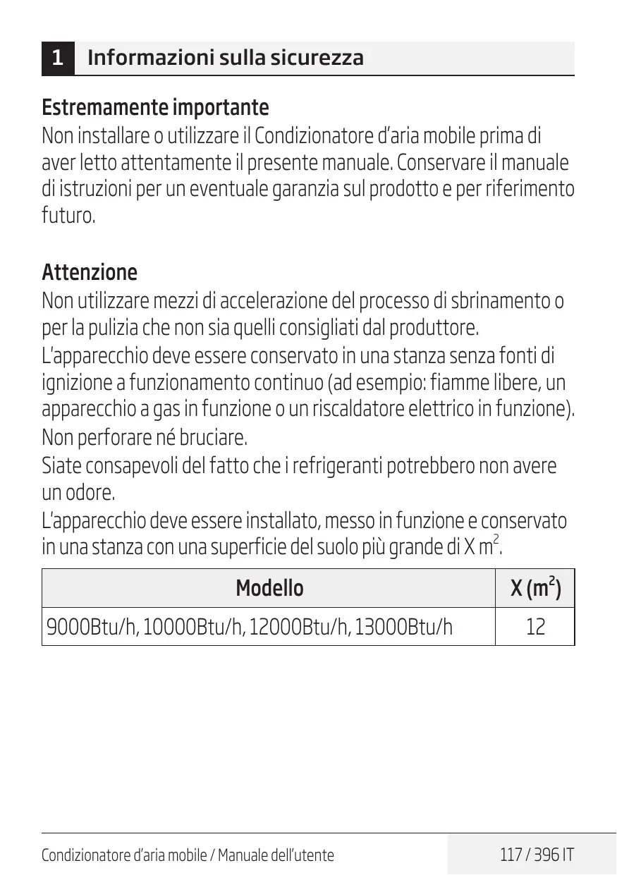 Estremamente importante Non installare o utilizzare il Condizionatore d’aria mobile prima di aver letto attentamente il presente manuale. Conservare il manuale di istruzioni per un eventuale garanzia sul prodotto e per riferimento futuro. Attenzione Non utilizzare mezzi di accelerazione del processo di sbrinamento o per la pulizia che non sia quelli consigliati dal produttore. L'apparecchio deve essere conservato in una stanza senza fonti di ignizione a funzionamento continuo (ad esempio: fiamme libere, un apparecchio a gas in funzione o un riscaldatore elettrico in funzione). Non perforare né bruciare. Siate consapevoli del fatto che i refrigeranti potrebbero non avere un odore. L'apparecchio deve essere installato, messo in funzione e conservato in una stanza con una superficie del suolo più grande di X m2. Modello 9000Btu/h, 10000Btu/h, 12000Btu/h, 13000Btu/h