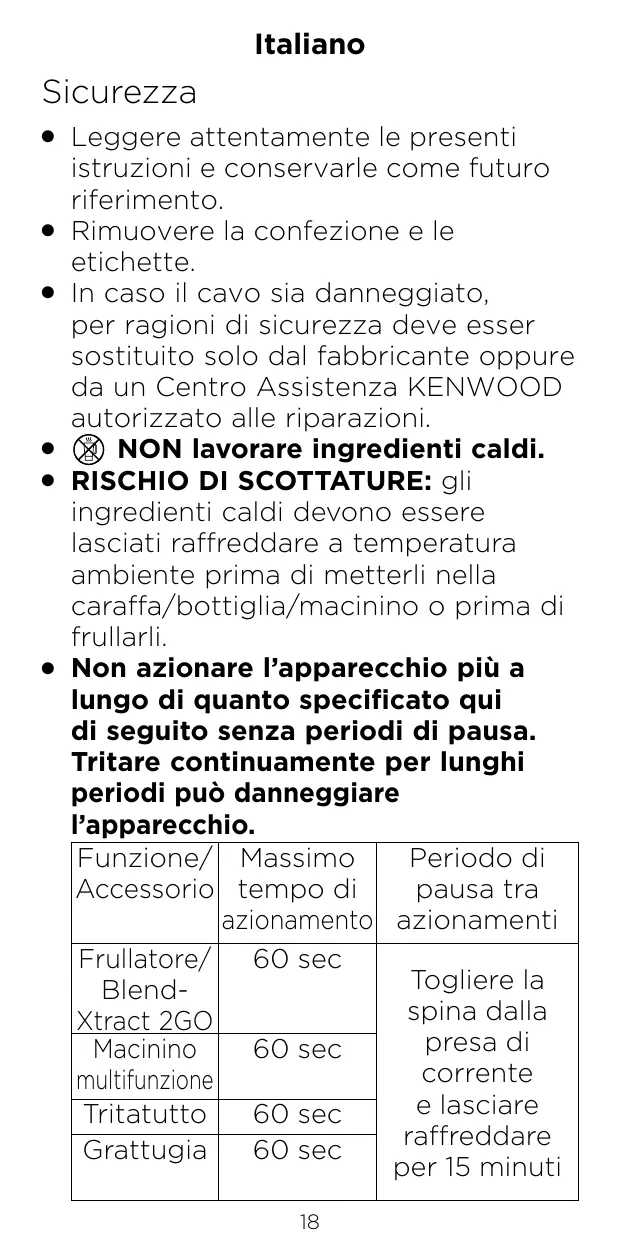 Blender/ Moulin à 60 sec refroidir râper pendant 15 minutes Éteignez et débranchez l’appareil avant le montage ou le démontage de pièces, lorsqu’il n’est pas utilisé ou avant le nettoyage. N’installez jamais l’unité portelames sur le bloc moteur sans que le gobelet/la bouteille du blender ou 10