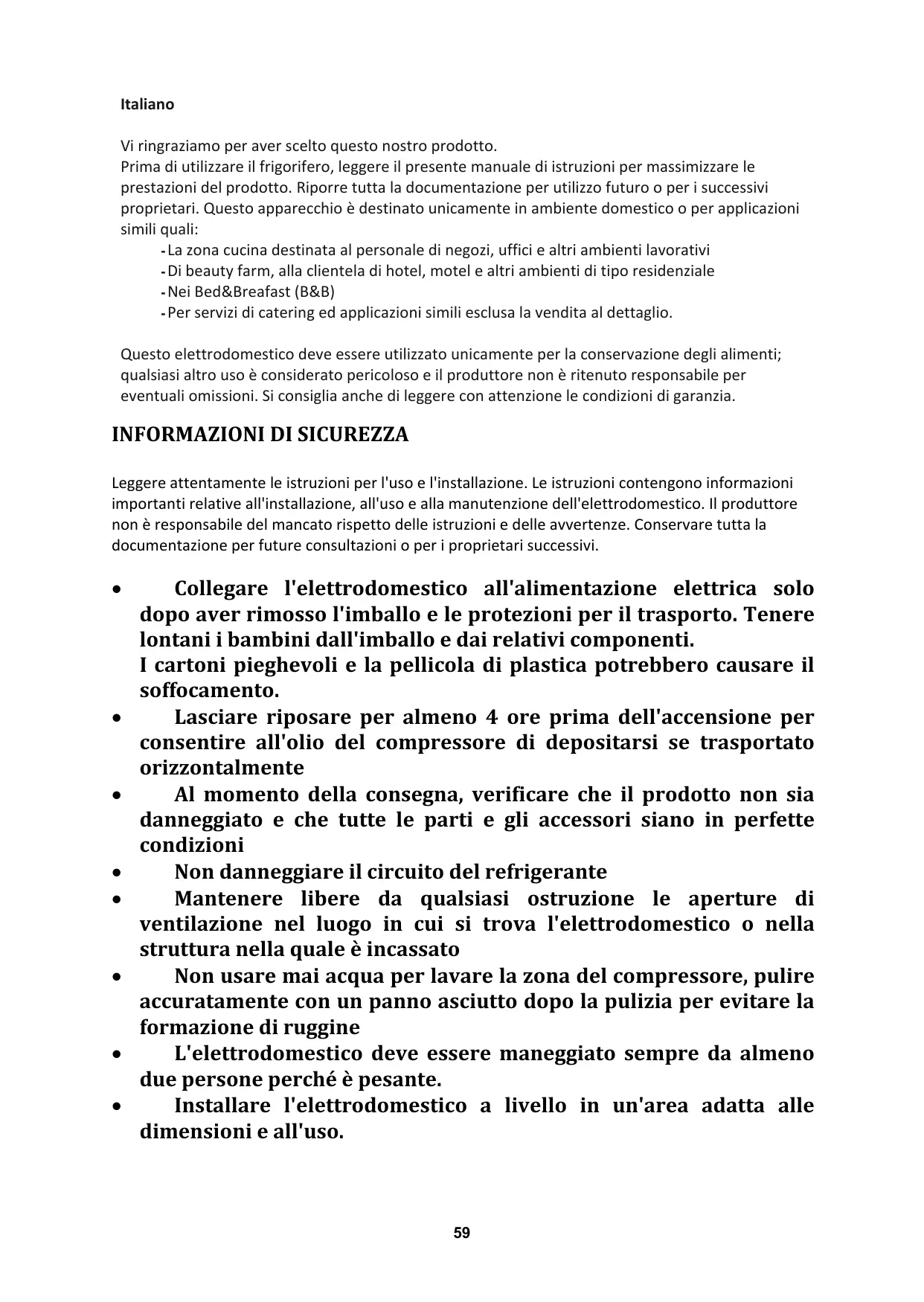 - dans les fermes-auberges, pour la clientèle des hôtels, motels et autres lieux de type résidentiel, - dans les chambres d'hôtes, - chez la restauration et autres services similaires, ce produit ne convient pas à la vente au détail. Cet appareil doit être utilisé uniquement pour conserver de la nourriture ; tout autre usage est considéré comme dangereux et le fabricant ne sera pas tenu responsable en cas de mauvaise utilisation. Il est donc recommandé de prendre connaissance des conditions de garantie.