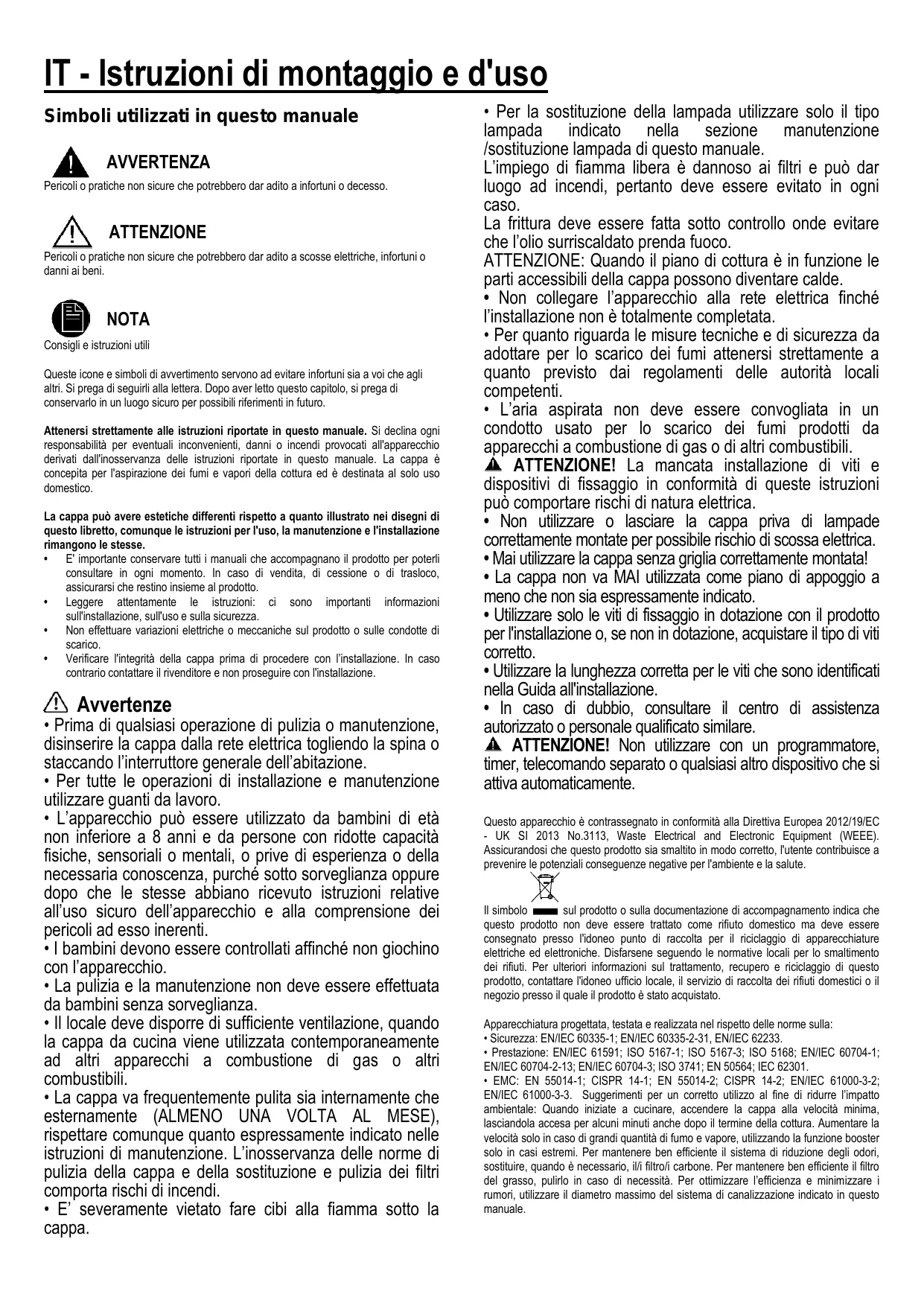 EN Instruction on mounting and use NL Installatiehandleiding en gebruiksaanwijzing PT Instruções para instalação e utilização RU Инструкция по монтажу и эксплуатации UK Інструкція з монтажу та експлуатації • No conectar la unidad a la red eléctrica hasta que la instalación sea totalmente completada. • En cuanto a las medidas técnicas y de seguridad a adoptar para la descarga de los humos, seguir estrictamente lo previsto por los reglamentos de las autoridades locales competentes. • El aire aspirado no debe ser transportado en un conducto usado para la descarga de humos producidos por dispositivos de combustión a gas u otros combustibles. ¡ATENCIÓN! Si no se instalan los tornillos y elementos de fijación de acuerdo con estas instrucciones se puede incurrir en riesgos de naturaleza eléctricos. • No utilizar ni dejar la campana sin las luces correctamente instaladas debido al posible riesgo de descarga eléctrica. • No utilizar nunca la campana sin la rejilla montada correctamente! • La campana NUNCA debe utilizarse como una superficie de apoyo a menos que así se indique específicamente. • Utilizar sólo los tornillos para fijación suministrados con el producto para su instalación, o, si no se suministran, comprar el tipo correcto de tornillos. Utilizar la longitud correcta para los tornillos que se identifican en la Guía de instalación. • En caso de duda, consultar el centro de asistencia autorizado o un similar personal calificado. ¡ATENCIÓN! No utilizar con un programador, temporizador, mando a distancia separado o cualquier otro dispositivo que se active automáticamente. Este aparato lleva el marcado CE en conformidad con la Directiva 2012/19/EC - UK SI 2013 No.3113 del Parlamento Europeo y del Consejo sobre residuos de aparatos eléctricos y electrónicos (RAEE). La correcta eliminación de este producto evita consecuencias negativas para el medioambiente y la salud.