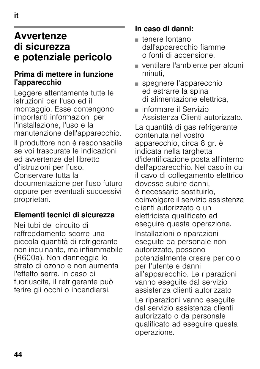 Avvertenze di sicurezza e potenziale pericolo Prima di mettere in funzione l'apparecchio Leggere attentamente tutte le istruzioni per l'uso ed il montaggio. Esse contengono importanti informazioni per l'installazione, l'uso e la manutenzione dell'apparecchio. Il produttore non à responsabile se voi trascurate le indicazioni ed awvertenze del libretto d'istruzioni per l’uso. Conservare tutta la documentazione per l'uso futuro oppure per eventuali successivi proprietari. Elementi tecnici di sicurezza Nei tubi del circuito di raffreddamento scorre una piccola quantità di refrigerante non inquinante, ma infiammabile (R600a). Non danneggia lo strato di ozono e non aumenta l'effetto serra. In caso di fuoriuscita, il refrigerante pud ferire gli occhi o incendiarsi.