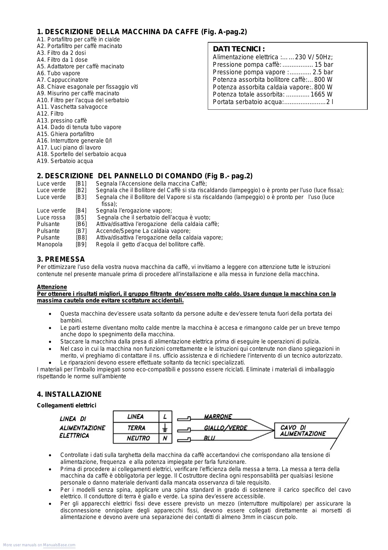 Controllate i dati sulla targhetta della macchina da caffè accertandovi che corrispondano alla tensione di alimentazione, frequenza e alla potenza impiegate per farla funzionare. Prima di procedere ai collegamenti elettrici, verificare l’efficienza della messa a terra. La messa a terra della macchina da caffè è obbligatoria per legge. Il Costruttore declina ogni responsabilità per qualsiasi lesione personale o danno materiale derivanti dalla mancata osservanza di tale requisito. Per i modelli senza spina, applicare una spina standard in grado di sostenere il carico specifico del cavo elettrico. Il conduttore di terra è giallo e verde. La spina dev’essere accessibile. Per gli apparecchi elettrici fissi deve essere previsto un mezzo (interruttore multipolare) per assicurare la disconnessione onnipolare degli apparecchi fissi, devono essere collegati direttamente ai morsetti di alimentazione e devono avere una separazione dei contatti di almeno 3mm in ciascun polo. More user manuals on ManualsBase.com
