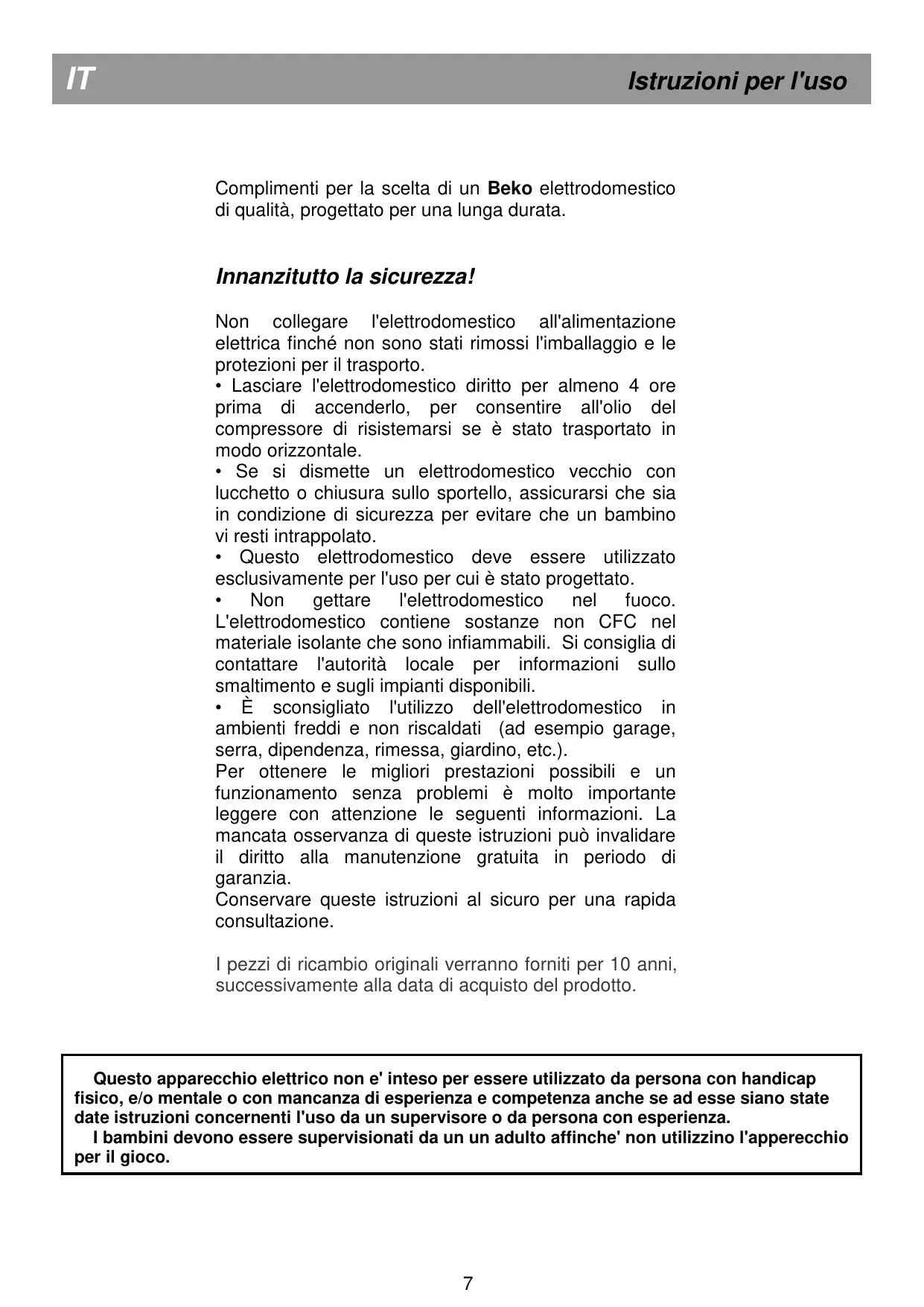 Avant l’utilisation /16 Congélation des produits frais /16 Fabrication de glaçons /16 Dégivrage /16 Ne connectez pas votre appareil à l’alimentation électrique avant d’avoir enlevé tous les emballages et protections de transport. • Attendez au moins 4 heures avant de le brancher pour permettre à l’huile du compresseur de se stabiliser si l’appareil a été transporté couché. • Si vous vous débarrassez d'un vieil appareil à ressort ou loquet intégré à la porte, prenez soin de le rendre hors de danger pour éviter que les enfants ne s'enferment à l’intérieur. • L’utilisation de cet appareil s’applique uniquement à l’usage prévu. • Ne vous débarrassez pas de l’appareil dans un feu. L’isolation de votre appareil contient des substances non CFC qui sont inflammables. Veuillez contacter les autorités locales pour obtenir des renseignements concernant la mise au rebut et les endroits existants. • L’utilisation de cet appareil dans une pièce froide, non chauffée n’est pas recommandée (garage, jardin d'hiver, annexe, abri, remise, etc.). Afin d’obtenir les meilleurs résultats possibles et un fonctionnement sans encombres de votre appareil, veuillez lire ces instructions attentivement. Le nonrespect de ces instructions pourrait annuler votre droit à l'assistance sans frais pendant la période de garantie. Veuillez conserver ces instructions soigneusement à titre de référence pratique. Les pièces détachées d’origine sont disponibles pendant 10 ans, à compter de la date d’achat du produit.