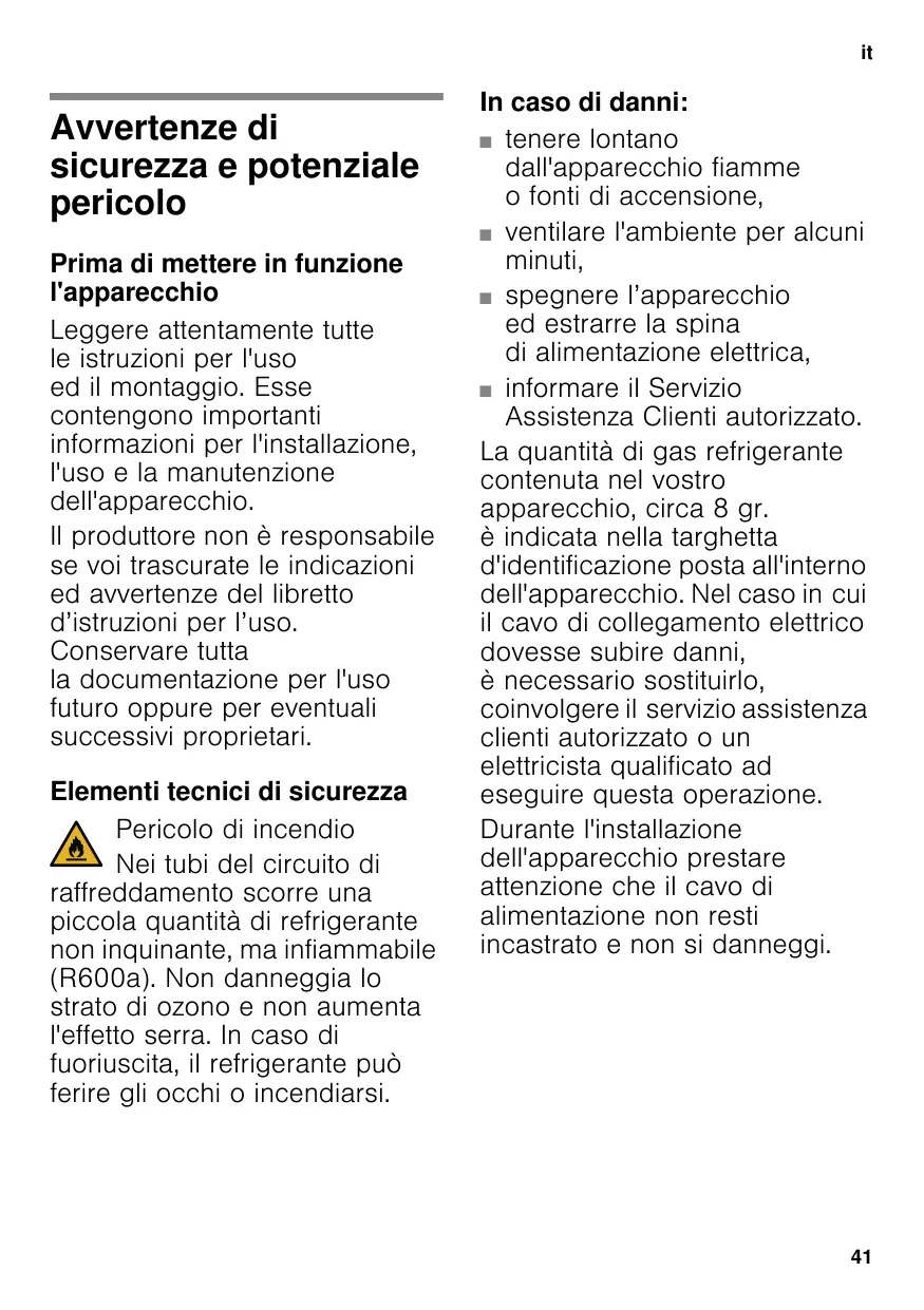 itIndiceitIstruzioni per l'usoFrigorifero combinato Avvertenze di sicurezza e potenziale pericolo Prima di mettere in funzione l'apparecchio Leggere attentamente tutte le istruzioni per l'uso ed il montaggio. Esse contengono importanti informazioni per l'installazione, l'uso e la manutenzione dell'apparecchio. Il produttore non è responsabile se voi trascurate le indicazioni ed avvertenze del libretto d’istruzioni per l’uso. Conservare tutta la documentazione per l'uso futuro oppure per eventuali successivi proprietari. Elementi tecnici di sicurezza Pericolo di incendio Nei tubi del circuito di raffreddamento scorre una piccola quantità di refrigerante non inquinante, ma infiammabile (R600a). Non danneggia lo strato di ozono e non aumenta l'effetto serra. In caso di fuoriuscita, il refrigerante può ferire gli occhi o incendiarsi. In caso di danni: ■ tenere lontano dall'apparecchio fiamme o fonti di accensione, ■ ventilare l'ambiente per alcuni minuti, ■ spegnere l’apparecchio ed estrarre la spina di alimentazione elettrica, ■ informare il Servizio Assistenza Clienti autorizzato. La quantità di gas refrigerante contenuta nel vostro apparecchio, circa 8 gr. è indicata nella targhetta d'identificazione posta all'interno dell'apparecchio. Nel caso in cui il cavo di collegamento elettrico dovesse subire danni, è necessario sostituirlo, coinvolgere il servizio assistenza clienti autorizzato o un elettricista qualificato ad eseguire questa operazione. Durante l'installazione dell'apparecchio prestare attenzione che il cavo di alimentazione non resti incastrato e non si danneggi.