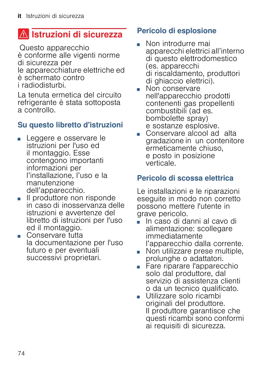 Non introdurre mai apparecchi elettrici all’interno di questo elettrodomestico (es. apparecchi di riscaldamento, produttori di ghiaccio elettrici). Non conservare nell'apparecchio prodotti contenenti gas propellenti combustibili (ad es. bombolette spray) e sostanze esplosive. Conservare alcool ad alta gradazione in un contenitore ermeticamente chiuso, e posto in posizione verticale. Pericolo di scossa elettrica Le installazioni e le riparazioni eseguite in modo non corretto possono mettere l'utente in grave pericolo. In caso di danni al cavo di alimentazione: scollegare immediatamente l’apparecchio dalla corrente. Non utilizzare prese multiple, prolunghe o adattatori. Fare riparare l'apparecchio solo dal produttore, dal servizio di assistenza clienti o da un tecnico qualificato. Utilizzare solo ricambi originali del produttore. Il produttore garantisce che questi ricambi sono conformi ai requisiti di sicurezza. Istruzioni di sicurezza it Pericolo di ustioni da freddo