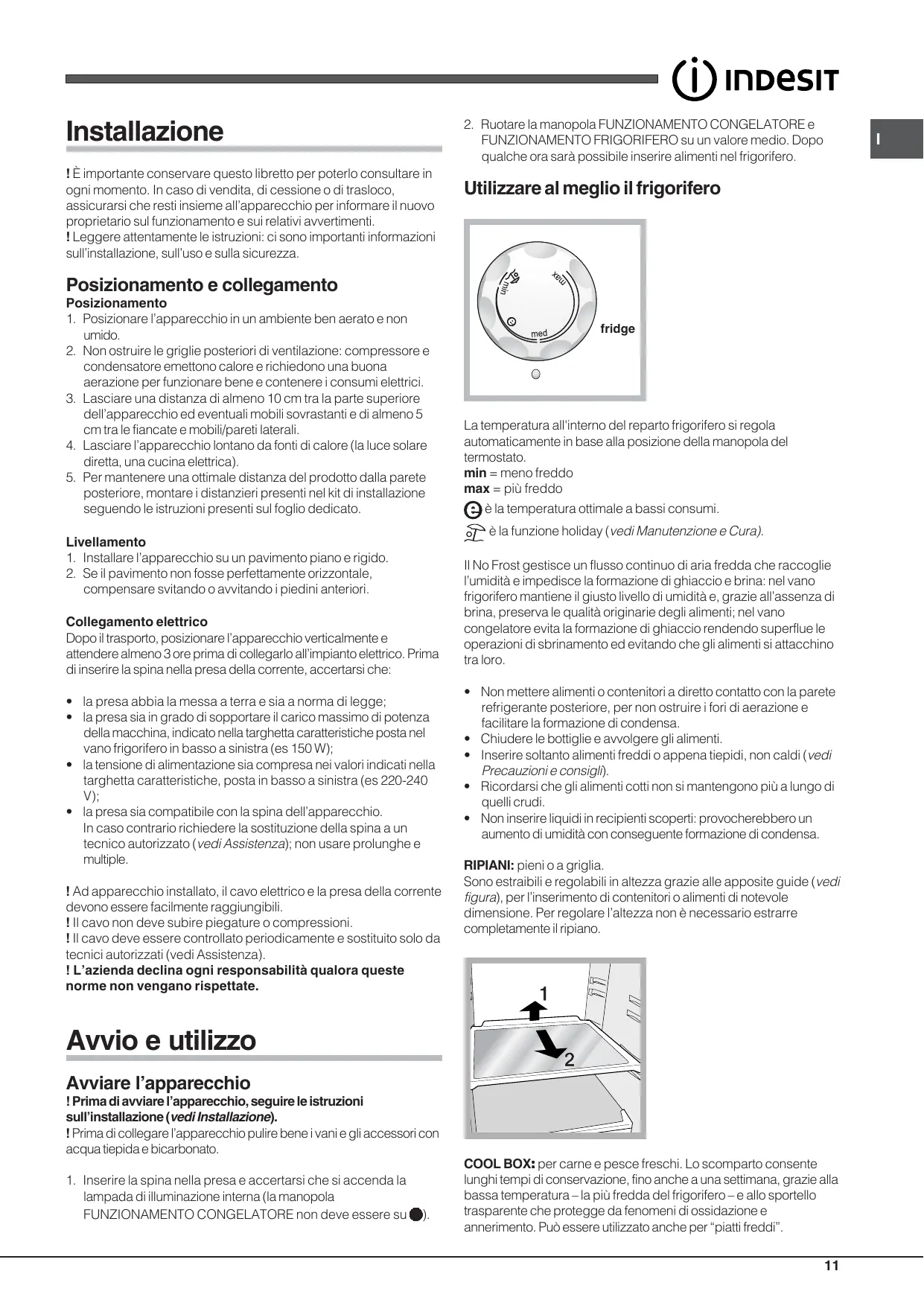 Mise en place 1. Placez l’appareil dans une pièce bien aérée et non humide. 2. Ne bouchez pas les grilles d’aération arrière : le compresseur et le condensateur produisent de la chaleur et exigent une bonne aération pour bien fonctionner et réduire la consommation d’électricité. 3. Prévoir au moins 10 cm entre le haut de l’appareil et les meubles installés au-dessus et au moins 5 cm entre les côtés et les meubles/parois latérales. 4. Installez l’appareil loin de sources de chaleur (rayons directs du soleil, cuisinière électrique). 5. Pour maintenir une distance optimale entre le produit et la paroi arrière, montez les cales d’espacement comprises dans le kit d’installation et suivez les instructions de la notice spécialement prévue. Mise à niveau 1. Installez l’appareil sur un sol plat et rigide. 2. Si le sol n’est pas parfaitement horizontal, vissez ou dévissez les petits pieds avant pour bien niveler l’appareil. Raccordement électrique Après le transport, placez l’appareil à la verticale et attendez au moins 3 heures avant de le raccorder à l’installation électrique. Avant de brancher la fiche dans la prise de courant, assurez-vous que: • la prise est bien munie d’une terre conforme à la loi; • la prise est bien apte à supporter la puissance maximale de l’appareil, indiquée sur la plaquette signalétique placée à l’intérieur du compartiment réfrigérateur en bas à gauche (ex. 150 W); • la tension d’alimentation est bien comprise entre les valeurs indiquées sur la plaquette signalétique, placée en bas à gauche (ex.220-240 V); • la prise est bien compatible avec la fiche de l’appareil. En cas d’incompatibilité, faites remplacer la fiche par un technicien agréé (voir Assistance); n’utilisez ni rallonges ni prises multiples. ! Après installation de l’appareil, le câble électrique et la prise de courant doivent être facilement accessibles. ! Le câble ne doit être ni plié ni excessivement écrasé. ! Il doit être contrôlé prériodiquement et ne peut être remplacé que par un technicien agréé (voir Assistance). ! Nous déclinons toute responsabilité en cas de non respect des normes énumérées ci-dessus.