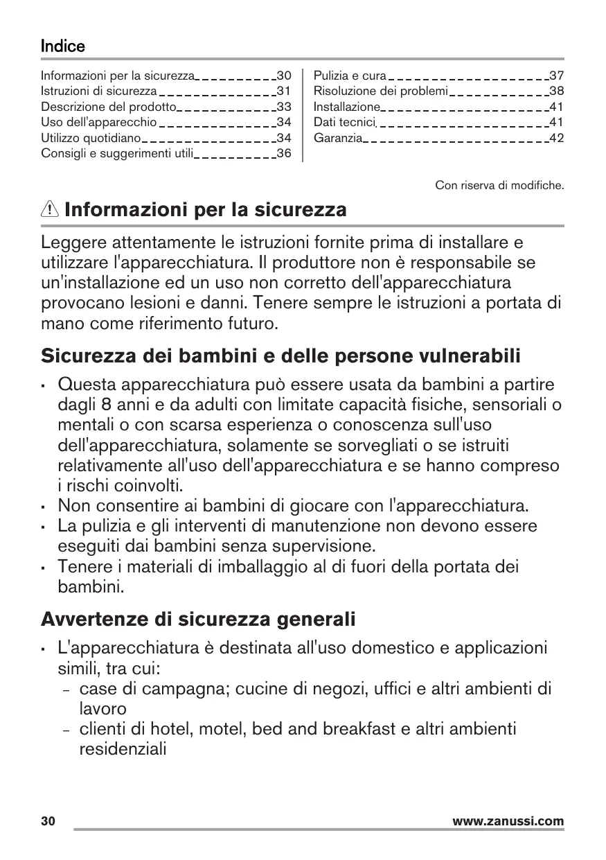 L'apparecchiatura è destinata all'uso domestico e applicazioni simili, tra cui: – case di campagna; cucine di negozi, uffici e altri ambienti di lavoro – clienti di hotel, motel, bed and breakfast e altri ambienti residenziali www.zanussi.com