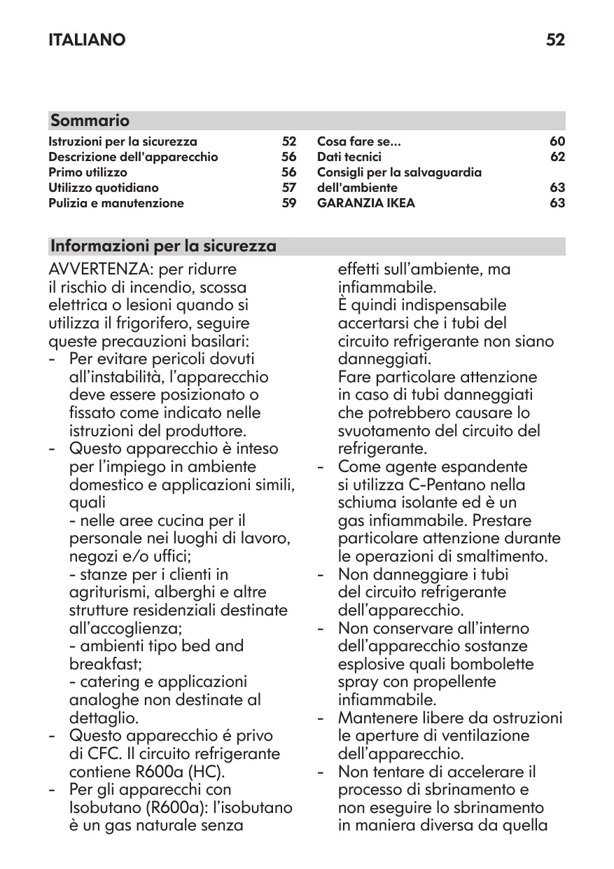 AVERTISSEMENT : pour réduire -les risques d’incendie, de choc électrique ou de blessures lors de l’utilisation du réfrigérateur, prendre quelques précautions fondamentales comme par exemple : -- pour éviter tout risque dû à un problème de stabilité, le positionnement et fixation de l’appareil doivent être réalisés conformément aux instructions du fabricant. -- Cet appareil est destiné à -un usage domestique et applications similaires, telles que : - une installation dans les coins cuisine de lieux de travail (commerces, bureaux, etc.) ; - une utilisation par les clients -d’hôtels, de motels et d’autres environnements de type résidentiel ; -- une installation dans des environnements de type chambres d’hôtes/B&B ; - des applications de type traiteur et applications hors -détail similaires. -- Cet appareil est sans CFC. Le circuit de réfrigérant contient -du R600a (HC).