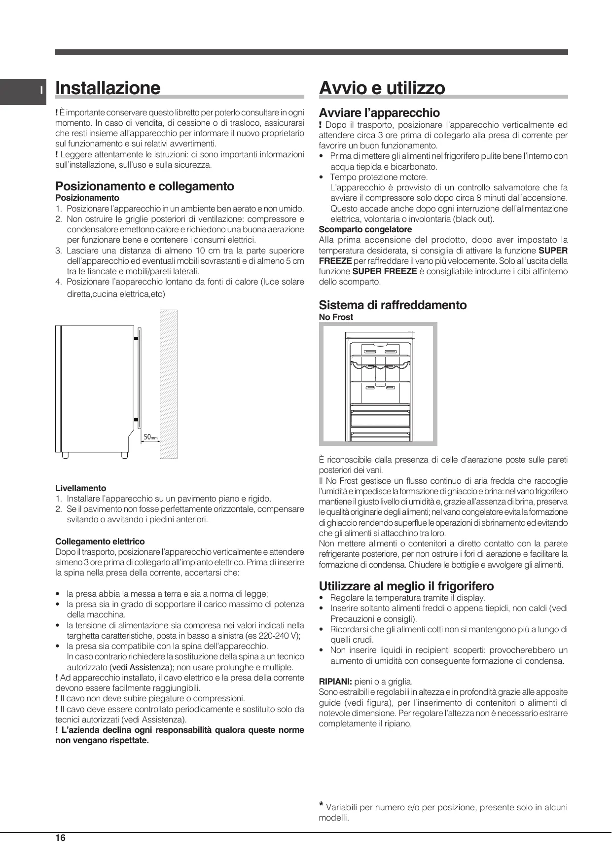 Le No Frost gère un flux continu d’air froid qui absorbe l’humidité et empêche la formation de glace et de givre: il maintient un niveau d’humidité adéquat à l’intérieur du compartiment réfrigérateur et, grâce à l’absence de givre, il préserve les qualités originaires des aliments; dans le compartiment congélateur il évite la formation de glace, il n’y a par conséquent plus besoin de dégivrer et les aliments ne collent plus entre eux.Ne placez pas d’aliments ou de récipients contre la paroi refroidissante arrière pour ne pas boucher les trous d’aération et éviter une formation rapide d’eau condensée. Fermez bien les bouteilles et emballez les aliments.