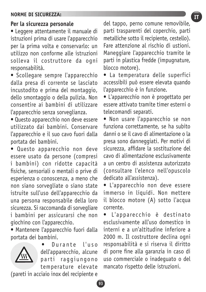 • L’ appareil n’est pas destiné à être mis en fonctionnement au moyen d’une minuterie extérieure ou par un système de commande à distance séparé. • N’utilisez pas votre appareil s’il ne fonctionne pas correctement, s’il a été endommagé ou si le câble d’alimentation ou la prise sont endommagés. Afin d’éviter tout danger, faites obligatoirement remplacer le cordon par un centre service agréé (voir liste dans le livret service). • L’appareil ne doit pas être immergé. Ne passez pas le bloc moteur (A) sous l’eau courante. • Cet appareil est exclusivement destiné à un usage domestique à l’intérieur de la maison et à une altitude inférieure à 2000 m. Le fabricant décline toute responsabilité et se réserve le droit de résilier la garantie en cas d’utilisation commerciale ou inadaptée, ou de non respect des consignes.