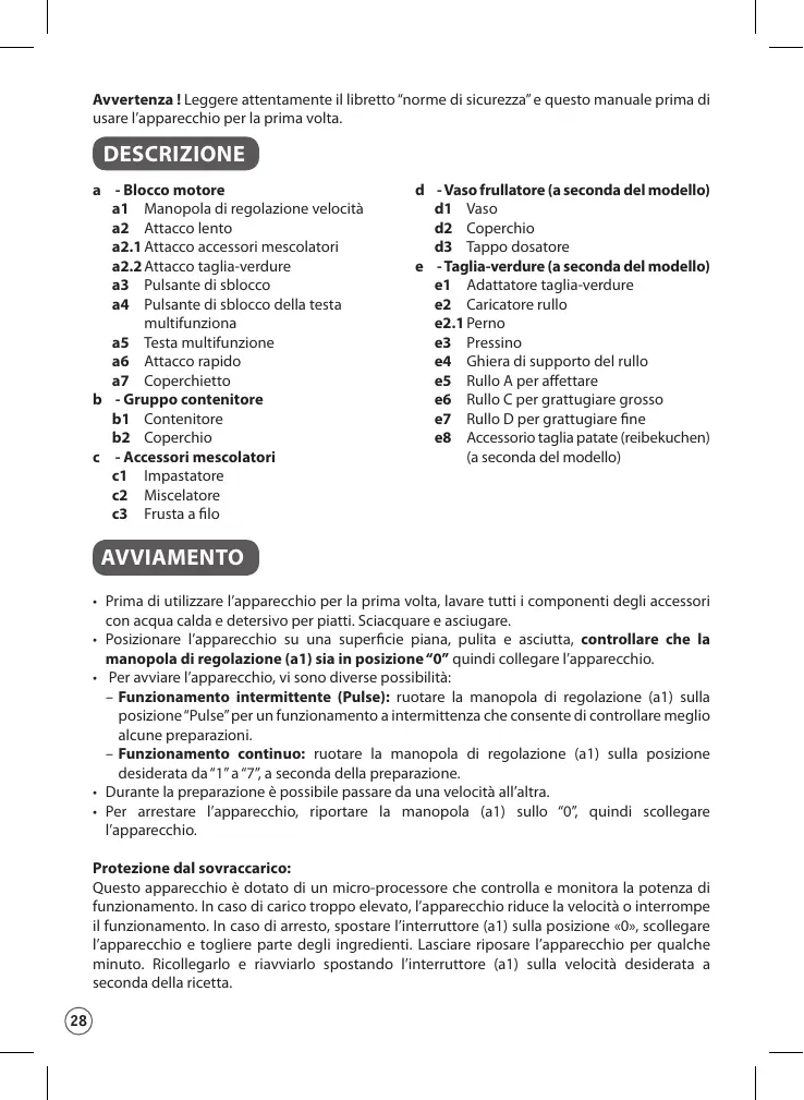 (a1) soit bien en position « 0 » puis branchez votre appareil. • Pour mettre en marche, vous avez plusieurs possibilités : ––Marche intermittente (pulse) : Tournez le bouton variateur (a1) sur la position « pulse » par impulsions successives pour un meilleur contrôle des préparations. ––Marche continue : Tournez le bouton variateur (a1) sur la position désirée de « 1 » à « 7 » selon les préparations effectuées. • Vous pouvez la modifier en cours de préparation. • Pour arrêter l’appareil, ramenez le bouton (a1) sur le « 0 », puis débranchez votre appareil. Protection surcharge : Votre appareil de cuisine est équipé d’un micro processeur qui contrôle et analyse la puissance en fonctionnement. En cas de charge trop importante, votre appareil s’adaptera en réduisant sa vitesse ou s’arrêtera tout seul. En cas d’arrêt, ramenez votre bouton variateur de vitesse (a1) sur la position «0», débranchez votre appareil et retirez une partie de vos ingrédients. Laissez votre appareil reposer quelques minutes. Vous pouvez alors le rebrancher et démarrer en tournant le bouton variateur (a1) sur la vitesse désirée selon la recette.