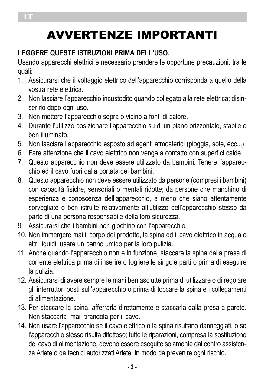 électrique; débranchez-le après chaque utilisation. 3. Ne placez pas l’appareil au dessus ou près de sources de chaleur. 4. Lors de son utilisation, placez l’appareil sur une surface horizontale et stable. 5. N’exposez jamais l’appareil aux agents atmosphériques externes (pluie, soleil, etc.). 6. Veillez à ce que le câble électrique n’entre jamais en contact avec des surfaces chaudes. 7. Cet appareil ne doit pas être utilisé par les enfants. Garder l’appareil et le cordon électrique loin de la portée des enfants. 8. Cet appareil ne doit pas être utilisé par des personnes (y compris les enfants) dont les capacités physiques, sensorielles ou mentales sont réduites, ou par des personnes manquant d’expérience et de connaissance d’appareil, à moins qu’elles ne soient attentivement surveillées et correctement instruites sur l’usage de l’appareil de la part d’une personne responsable de leur sécurité. 9. Vérifiez que les enfant ne jouent pas avec l’appareil. 10. Ne pas plonger le corps du produit, la fiche ni le cable electrique dans l’eau ou autres liquides, et utiliser toujours un chiffon humide pour les nettoyer. 11. Meme lorsque l’appareil n’est pas en marche, debrancher la fiche de la prise de courant electrique avant d’installer ou de defaire les simples parties ou avant de proceder au nettoyage. 12. Vérifier d’avoir toujours les mains sèches avant d’utiliser ou de régler les interrupteurs placés sur l’appareil ou avant de manipuler la fiche et les connexions électriques. 13. Pour débrancher l’appareil, saisir directement la fiche en la débranchant de la prise murale. Ne tirez jamais sur le câble d’alimentation. 14. Ne pas utiliser l’appareil si le cordon electrique ou la fiche sont endommages ou si l’appareil est defectueux; toutes les reparations, y compris la substitution du cordon d’alimentation, doivent etre effectuees exclusivement par le centre de service apres-vente Ariete ou par des techniciens agrees Ariete, de façon a prevenir tout risque de danger. - 13 -