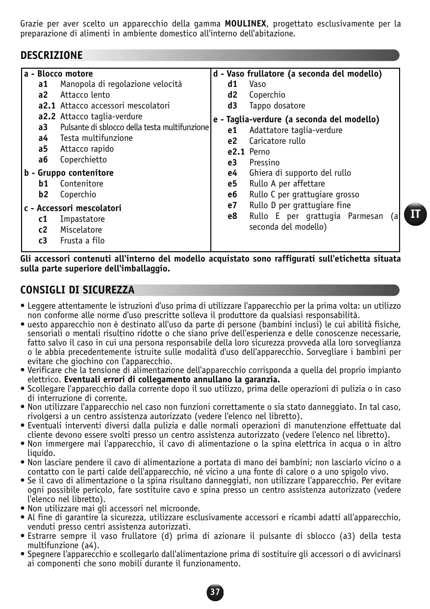 2.3 - DISMANTLING THE ACCESSORY • Führen Sie niemals Utensilien (Löffel, Küchenspachtel ...) durch die Öffnung des Deckels (d2), in die Rührschüssel • Este aparato no está diseñado para que lo utilicen personas (incluyendo niños) con alguna discapacidad física, sensorial o mental, o con falta de experiencia y conocimientos, a no ser que sean supervisadas, o que la persona responsable de su seguridad les haya proporcionado instrucciones sobre el funcionamiento del aparato. No permita que los niños jueguen con el aparato. • Compruebe que la tensión de alimentación del aparato coincide con la tensión de su red eléctrica. Cualquier conexión incorrecta anulará la garantía. • Desconecte siempre el aparato cuando deje de utilizarlo, en caso de corte de corriente o cuando proceda a su limpieza. • No utilice el aparato si no funciona correctamente o si se ha estropeado. En este caso, diríjase a un centro de servicio oficial (consulte la lista en el folleto de servicio). • Cualquier tarea de mantenimiento, salvo las tareas de limpieza y conservación habituales realizadas por el cliente, debe llevarse a cabo en un centro de servicio oficial (consulte la lista en el folleto de servicio). • No sumerja el aparato, el cable de alimentación o el enchufe en agua u otro líquido. • No deje el cable de alimentación colgando al alcance de los niños, cerca o en contacto con las partes calientes del aparato, cerca de una fuente de calor o en un ángulo vivo. • No utilice el aparato si el cable de alimentación o el enchufe están dañados. Para evitar cualquier riesgo, estas piezas deben sustituirse siempre en un centro de servicio oficial (consulte la lista en el folleto de servicio). • No meta los accesorios en el microondas. • Por su seguridad, utilice únicamente accesorios y piezas de recambio adecuadas para el aparato, suministradas por un centro de servicio oficial. • Retire siempre el vaso mezclador (d) antes de pulsar el botón de desbloqueo (a3) del cabezal multifunción (a4). • Apague el aparato y desconéctelo de la red eléctrica cuando vaya a cambiar los accesorios o a tocar alguna de las piezas que son móviles durante su funcionamiento. • Deberá tener cuidado al manipular las cuchillas afiladas de los accesorios (d y e), al vaciar los recipientes o al limpiar el aparato, ya que pueden provocar cortes graves. • No toque los accesorios mezcladores mientras el aparato esté en funcionamiento. • Ponga en marcha el aparato girando el botón regulador (a1) hasta la velocidad deseada en función de la receta. • Puede añadir los alimentos por el orificio de la tapa (b2) durante la preparación. • Para detener el aparato, devuelva el botón (a1) a la posición "0". Consejos: - Amasar Para un mejor control de la mezcla y una mejor homogeneización de la preparación, utilice la posición "Pulse". Puede añadir alimentos durante la preparación, retirando el tapón dosificador (d3) de la tapa (d2). • Para detener el aparato, devuelva el botón (a1) a la posición "0".
