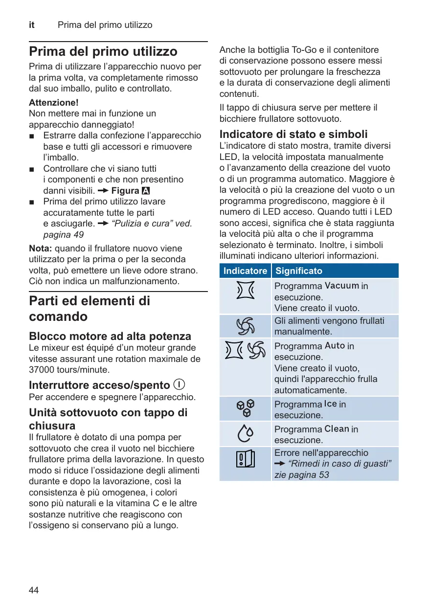 L’indicatore di stato mostra, tramite diversi LED, la velocità impostata manualmente o l’avanzamento della creazione del vuoto o di un programma automatico. Maggiore è la velocità o più la creazione del vuoto o un programma progrediscono, maggiore è il numero di LED acceso. Quando tutti i LED sono accesi, significa che è stata raggiunta la velocità più alta o che il programma selezionato è terminato. Inoltre, i simboli illuminati indicano ulteriori informazioni. Indicatore Significato Programma in esecuzione. Viene creato il vuoto. Gli alimenti vengono frullati manualmente. Programma in esecuzione. Viene creato il vuoto, quindi l'apparecchio frulla automaticamente. Programma esecuzione.