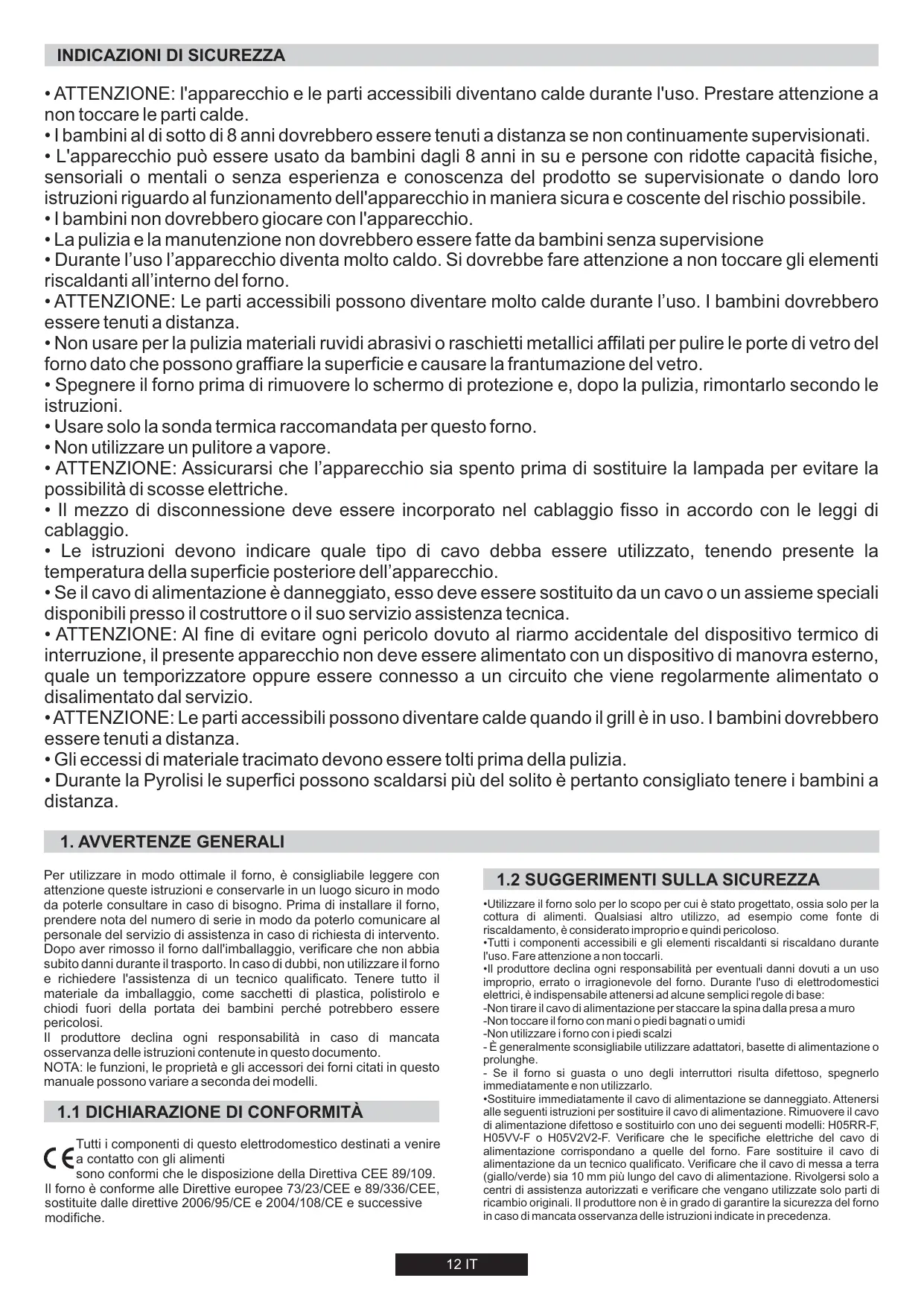 • Los medios de desconexión deben ser incorporados en el cableado fijo en conformidad con las reglas del cableado. • las instrucciones indicarán el tipo de cable a utilizar, teniendo en cuenta la temperature de la parte posterior del aparato. • Si el cable de alimentación está dañado, se debe sustituir por un cable o conjunto especial suministrado por el fabricante o el servicio técnico. PRECAUCIÓN: Con el fin de evitar peligros derivados de alteraciones en el suministro energético, este aparato no debe ser suministrado a través de un dispositivo de conmutación externo, como un temporizador, o conectado a un circuito que sea encendido y apagado frecuentemente por los servicios públicos. PRECAUCIÓN: Las partes accesibles se pueden calentar con el uso del grill. Los niños deben permanecer alejados. • Se debe eliminar el exceso de derrames antes de la limpieza. • Durante la operación de auto limpieza pirolítica, las superficies pueden calentarse más de lo habitual; los niños deben permanecer alejados. 1. ADVERTENCIAS GENERALES Leer las instrucciones detalladamente para sacar el mejor partido del horno. Recomendamos conservar las instrucciones de instalación y utilización para futuras consultas. Antes de instalar el horno anote el número de serie por si necesitase contactar con el servicio de atención al cliente. Una vez desembalado el horno, asegurarse de que no está dañado. En caso de tener dudas, no utilizar. Contactar con una persona cualificada. Conservar el embalaje (bolsas de plástico, polietileno o clavos) fuera del alcance de los niños ya que puede ser peligroso para ellos. La compañía no se hará responsable en caso de no cumplir las instrucciones indicadas en este documento.