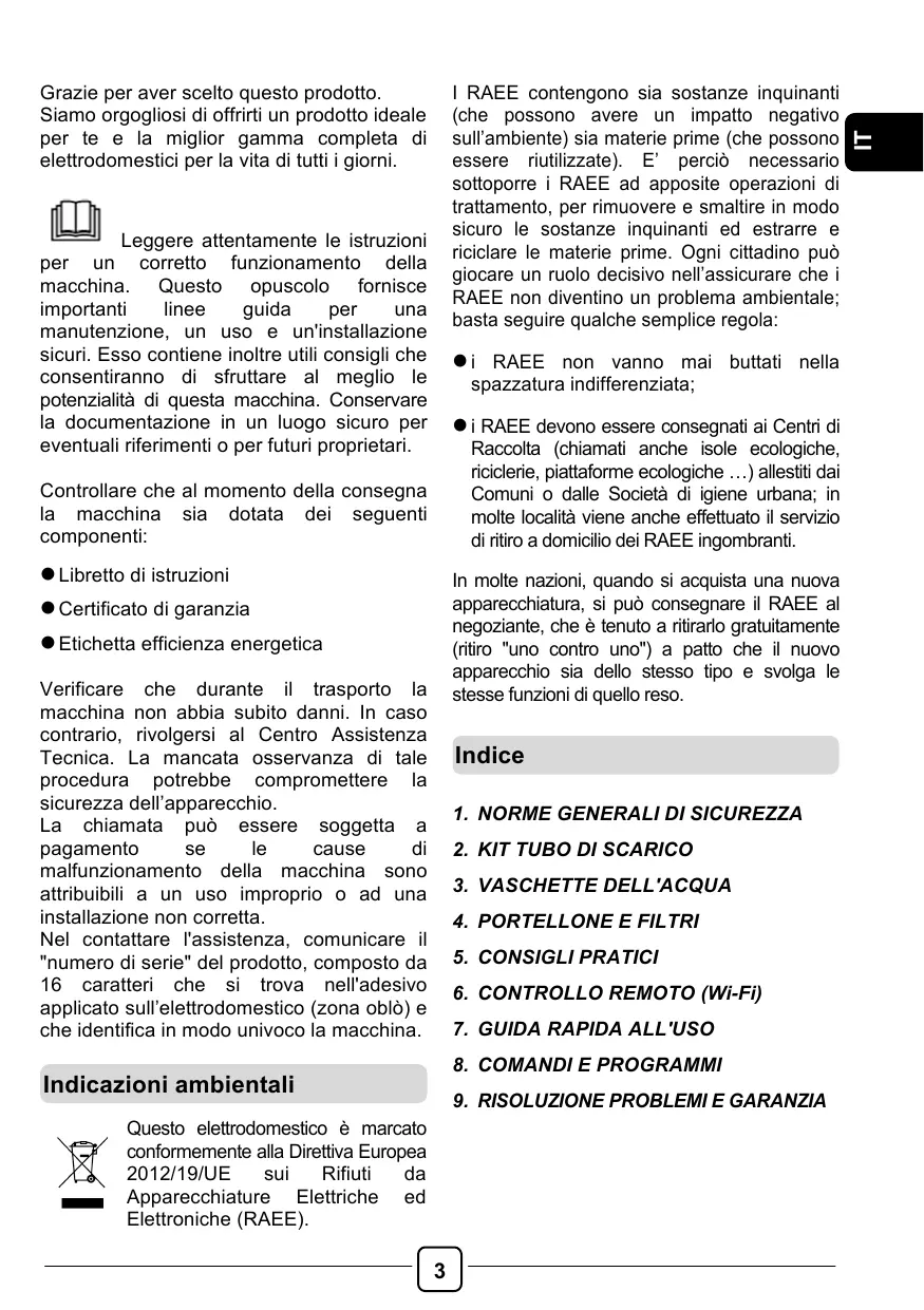 Indice 1. NORME GENERALI DI SICUREZZA 2. KIT TUBO DI SCARICO 3. VASCHETTE DELL'ACQUA 4. PORTELLONE E FILTRI 5. CONSIGLI PRATICI 6. CONTROLLO REMOTO (Wi-Fi) 7. GUIDA RAPIDA ALL'USO
