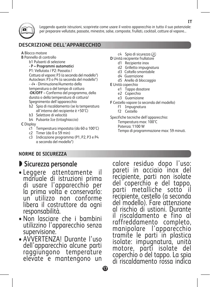 ASTART Blocco motore B Pannello di controllo b1 Pulsanti di selezione - P – Programmi automatici P1: Vellutata / P2: Passata / Cottura al vapore: P3 (a seconda del modello*) Autoclean: P3 o P4 (a seconda del modello*) - -/+ - Diminuzione/Aumento della temperatura o del tempo di cottura -OK/OFF – Conferma del programma, della durata o della temperatura di cottura/ Spegnimento dell’apparecchio b2 Spia di riscaldamento (se la temperatura all’interno del recipiente è >50°C) b3 Selettore di velocità b4 Pulsante Ice (tritaghiaccio) C Display c1 Temperatura impostata (da 60 a 100°C) c2 Timer (da 0 a 59 min) c3 Indicazione programma (P1, P2, P3 e P4 a seconda del modello*) c4 Spia di sicurezza D Unità recipiente frullatore d1 Recipiente inox d2 Grilletto impugnatura d3 Coltello smontabile d4 Guarnizione d5 Anello di bloccaggio E Unità coperchio e1 Tappo dosatore e2 Coperchio e3 Guarnizione F Cestello vapore (a seconda del modello) f1 Impugnatura f2 Cestello Specifiche tecniche dell’apparecchio: Temperatura max: 100°C Potenza: 1100 W Tempo di programmazione max: 59 minuti. START