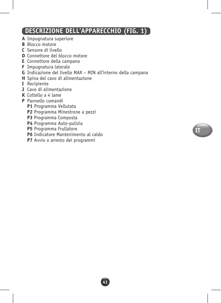 A B C D E F G H I J K P Impugnatura superiore Blocco motore Sensore di livello Connettore del blocco motore Connettore della campana Impugnatura laterale Indicazione del livello MAX – MIN all’interno della campana Spina del cavo di alimentazione Recipiente Cavo di alimentazione Coltello a 4 lame Pannello comandi P1 Programma Vellutata P2 Programma Minestrone a pezzi P3 Programma Composta P4 Programma Auto-pulizia P5 Programma Frullatore P6 Indicatore Mantenimento al caldo P7 Avvio o arresto dei programmi