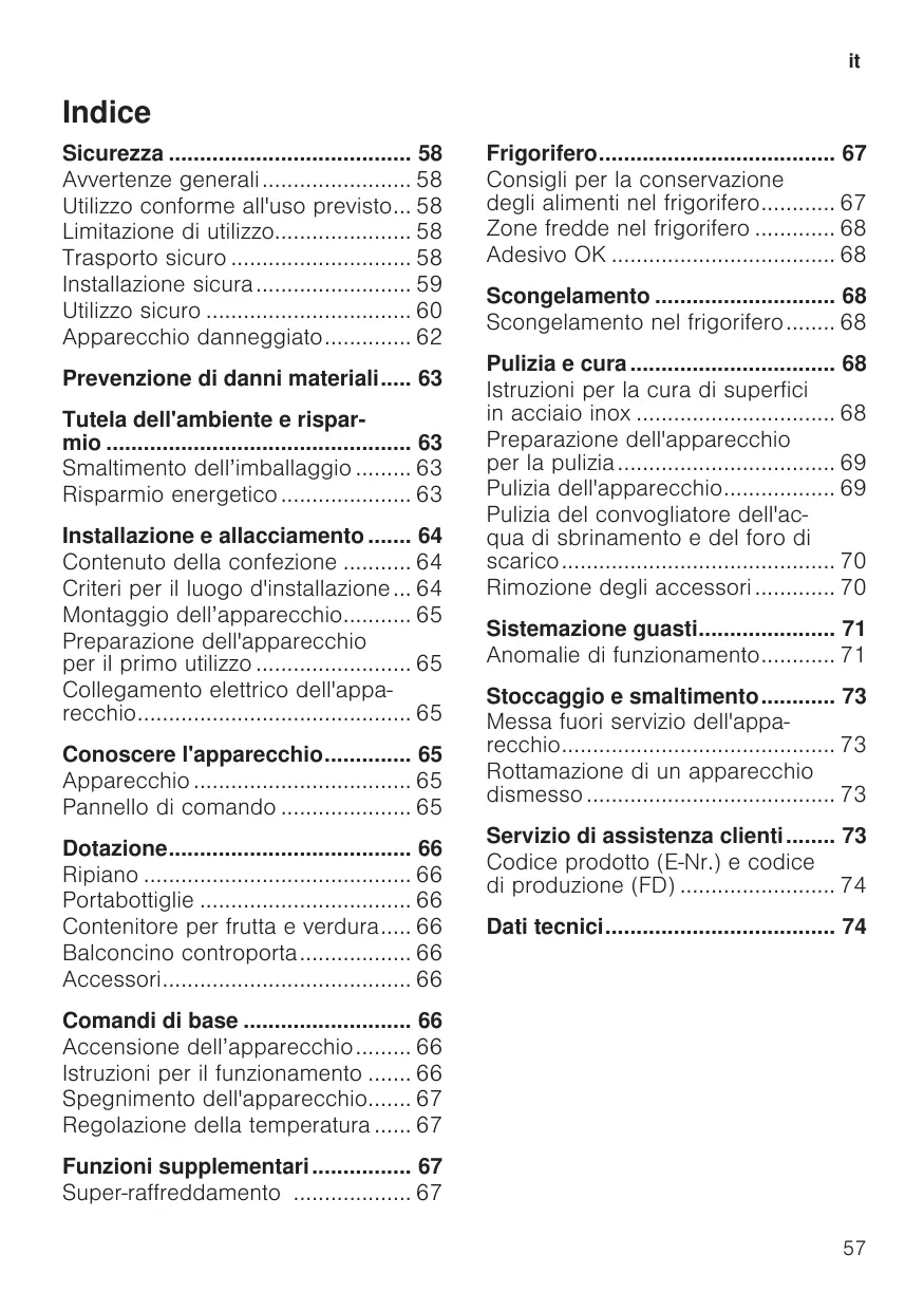 Indice Sicurezza 58 Avvertenze generali 58 Utilizzo conforme all'uso previsto... 58 Limitazione di utilizzo 58 Trasporto sicuro 58 Installazione sicura 59 Utilizzo sicuro 60 Apparecchio danneggiato 62 Prevenzione di danni materiali 63 Tutela dell'ambiente e risparmio 63 Smaltimento dell’imballaggio 63 Risparmio energetico 63 Installazione e allacciamento 64 Contenuto della confezione 64 Criteri per il luogo d'installazione ... 64 Montaggio dell’apparecchio 65 Preparazione dell'apparecchio per il primo utilizzo 65 Collegamento elettrico dell'apparecchio 65 Conoscere l'apparecchio 65 Apparecchio 65 Pannello di comando 65 Dotazione 66 Ripiano 66 Portabottiglie 66 Contenitore per frutta e verdura 66 Balconcino controporta 66 Accessori 66