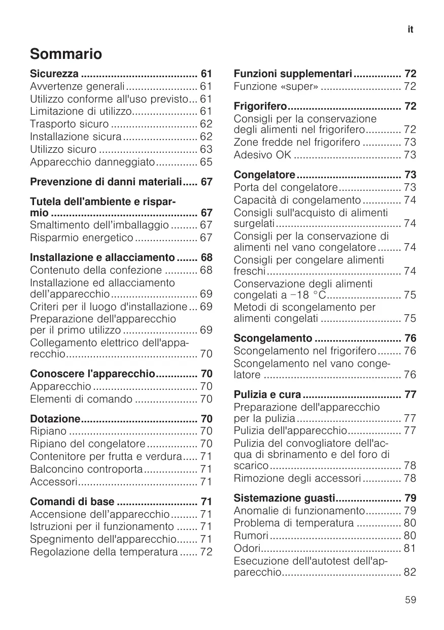 • Consigli per la conservazione di alimenti nel vano congelatore p. 74