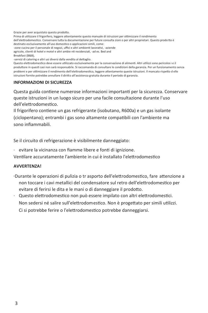 · Ne touchez pas aux pièces de réfrigération internes, en particulier si vos mains sont humides, car vous pourriez vous brûler ou vous ble sser. · Maintenir les ouvertures de ventilation situées dans le bâti de l'appareil ou sur la structure encastrée, libres de toute obstruction. · Ne pas utiliser d'objets pointus ou tranchants comme des couteaux ou des fourchettes pour retire la couche de glace . · Ne jamais utiliser de sèche -cheveux, de chauffages électriques ou d'autres appareils électriques similaires pour le dégivrage. · Ne pas gratter avec un couteau ou un objet tranchant pour retirer le givre ou la glace apparus. Ceux -ci pourraient causer des dégâts sur le circuit réfrigérant, toute projection en résultat peut provoquer un incendie ou endommager vos yeux. · Ne pas utiliser de dispositifs mécaniques ou d'autre équipement pour accélérer le processus de dégivrage. · Éviter impérativement l'utilisation de flamme nue ou d’un équipement électrique, comme des radiateurs, des nettoyeurs à vapeur, des bougies, des lampes à pétrole ou similaires pour accélérer la phase de dégivrage. · Ne jamais utiliser de l’eau pour laver le compresseur, l’essuyer avec un chiffon sec après le nettoyage pour éviter la rouille. · Il est recommandé de garder la fiche dans un état propre, tout résidu de poussière présente en excès sur la fiche peut être la cause d'un incendie. · Le produit est conçu et fabriqué pour un usage domestiqu e uniquement. · La garantie s'annule si le produit est installé ou utilisé dans des espaces domestiques non-résidentiels ou commerciaux ; · Le produit doit être correctement installé, positionné et utilisé conformément aux instructions contenues dans le Manu el d’instructions de l’utilisateur fourni . · La garantie s'applique uniquement aux produits neufs et n’est pas transférable si le produit est revendu. · Notre entreprise décline toute responsabilité pour les dommages accessoires ou consécutifs. · La garantie ne diminue en rien vos droits statutaires ou juridiques.