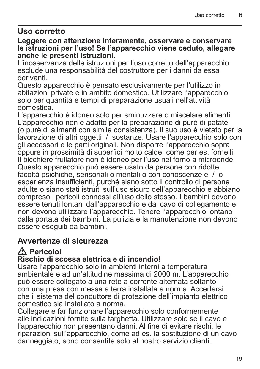 Avvertenze di sicurezza Non connettere mai l’apparecchio a temporizzatori o prese elettriche telecomandate. Sorvegliare sempre l’apparecchio durante il funzionamento! Si consiglia di non lasciare mai l’apparecchio acceso più a lungo di quanto è necessario per la lavorazione del frullato. Non mettere mai il cavo d’alimentazione a contatto con parti calde o tirarlo sopra spigoli vivi. Non immergere mai l’apparecchio in acqua né lavarlo in lavastoviglie. Non usare l’apparecchio con le mani bagnate e non farlo funzionare a vuoto. Non immergere l’apparecchio nell’alimento da frullare oltre il punto di unione fra piede frullatore ed apparecchio base. L’apparecchio va sempre scollegato dalla rete elettrica dopo ogni utilizzo, se lasciato incostudito, prima del montaggio, dello smontaggio, della pulizia e in caso di guasto. W Pericolo! Pericolo di lesioni! Prestare attenzione quando si maneggiano lame di taglio affilate, quando si svuota la ciotola e durante la pulizia. Non appena viene spento l’apparecchio, attendere che le lame del piede frullatore si siano fermate. Prima di cambiare gli accessori o le parti aggiuntive in movimento durante il funzionamento, spegnere l’apparecchio e scollegarlo dalla rete elettrica.Applicare e rimuovere gli accessori solo ad apparecchio fermo. Non inserire mai le mani nel bicchiere frullatore. Non pulire mai a mani nude la lama del piede frullatore. Usare una spazzola. W Pericolo! Pericolo di ustioni! Fare attenzione durante la lavorazione di alimenti da frullare bollenti. Gli alimenti da frullare bollenti possono schizzare durante la lavorazione. Non deporre mai il piede frullatore su superfici molto calde, né utilizzarlo in alimenti da frullare bollenti. Prima di lavorare alimenti da frullare bollenti, farli raffreddare ad almeno 80°C. Se si usa il frullatore ad immersione in una pentola, togliere prima la pentola dal fuoco. W Pericolo! Pericolo di soffocamento! Non lasciare che i bambini giochino con il materiale di imballaggio.