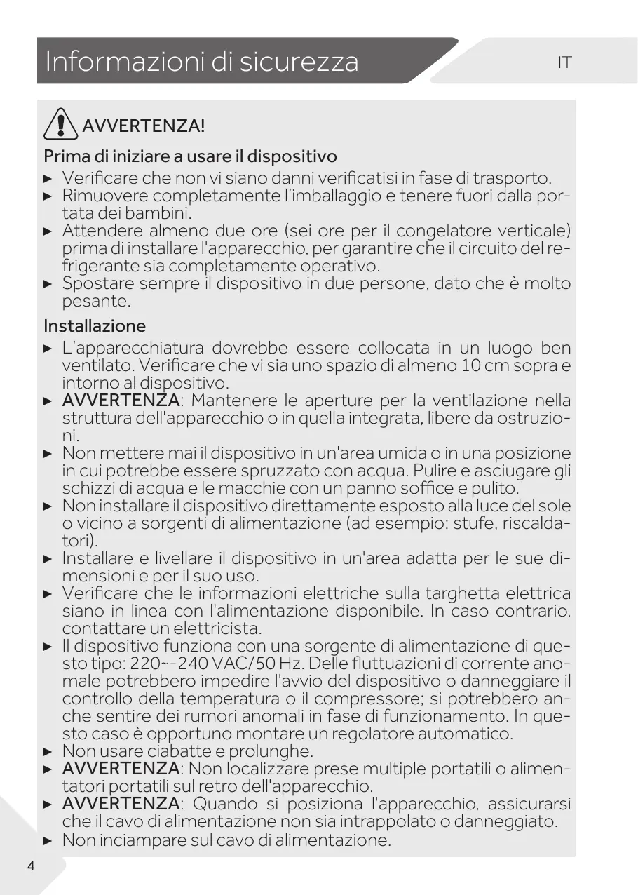 ▶ Il faut toujours au moins deux personnes pour la manipulation de l’appareil car il est lourd. Installation ▶ Placez l'appareil dans un endroit bien ventilé. Laissez un espace d'au moins 10 cm au-dessus et autour de l'appareil. ▶ AVERTISSEMENT : Les ouvertures d’aération du boîtier de l’appareil ou du modèle encastrable doivent être libres de toute obstruction. ▶ Ne placez jamais l'appareil dans une zone ou à un endroit humide où il pourrait être éclaboussé par de l'eau. Nettoyez et séchez les éclaboussures d'eau et les tâches à l'aide d'un chiffon doux et propre. ▶ N'installez pas l'appareil en direction des rayons solaires ou à proximité des sources de chaleur (par exemple, les cuisinières, chauffe-eau). ▶ Installez et positionnez l'appareil dans un espace adéquat tenant compte de sa taille et son utilisation. ▶ Vérifiez que les informations électriques sur la plaque signalétique sont conformes à l'alimentation électrique. Si ce n'est pas le cas, veuillez contacter un électricien. ▶ L’appareil fonctionne avec une alimentation de 220~240 VCA/50 Hz. Des fluctuations anormales de tension peuvent entraîner un échec de démarrage ou endommager le régulateur de température ou le compresseur, ou l'appareil peut émettre un bruit anormal pendant le fonctionnement. Dans de tels cas, installez un régulateur automatique. ▶ N’utilisez pas des adaptateurs multiprises et des rallonges. ▶ AVERTISSEMENT : N’installez pas plusieurs prises d’alimentation portatives ou blocs d’alimentation portatifs à l’arrière de l’appareil. ▶ AVERTISSEMENT : Lors du positionnement de l’appareil, assurez-vous que le cordon d’alimentation n’est pas coincé ou endommagé. ▶ Évitez de marcher sur le câble d'alimentation. 4