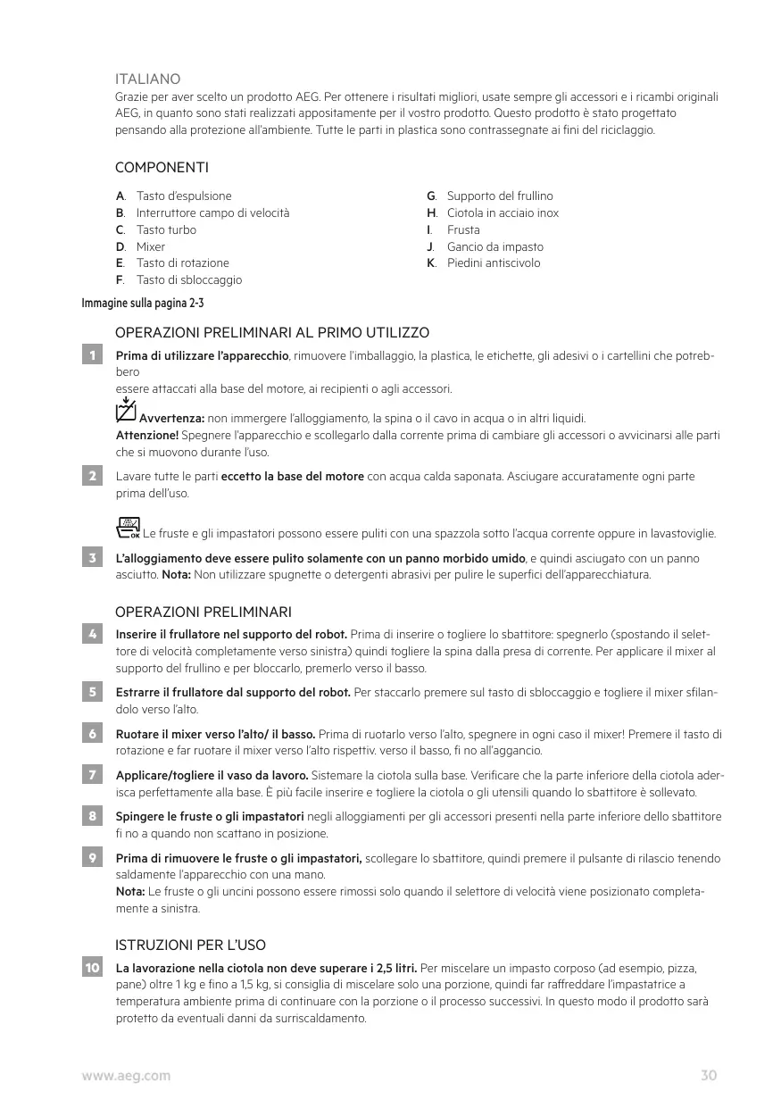 Avant d’utiliser l’appareil pour la première fois, il est impératif de lire attentivement les instructions suivantes. • Cet appareil peut être utilisé par des personnes dont les capacités physiques, sensorielles et mentales sont réduites ou dont les connaissances et l‘expérience sont insuffisantes, à condition d‘être surveillés ou d‘avoir reçu des instructions concernant l‘utilisation sécurisée de l‘appareil et de comprendre les risques encourus. • Les enfants doivent être surveillés pour éviter qu’ils ne jouent avec cet appareil. • Ne jamais utiliser ou prendre l’appareil si – le cordon d’alimentation est endommagé, – le boîtier est endommagé. • Si l’appareil ou le cordon d’alimentation sont endommagés, ils doivent être remplacés par le fabricant, l’un de ses réparateurs ou toute autre personne dûment qualifiée, afin d’éviter tout danger. • Toujours débrancher l’appareil de l’alimentation électrique s’il est laissé sans surveillance et avant toute opération de montage, de démontage ou de nettoyage. • Faire bien attention lors de la manipulation des accessoires, du vidage du bol et des opérations de nettoyage. • Éteignez l’appareil et débranchez-le de d’alimentation avant de remplacer les accessoires ou d’approcher les éléments en mouvement en cours d’utilisation. • Ne pas plonger l’appareil dans l’eau ni dans aucun autre liquide. • Cet appareil est exclusivement destiné à un usage domestique. Le fabricant décline toute responsabilité en cas de dommages résultant d’une utilisation incorrecte de l’appareil. www.aeg.com