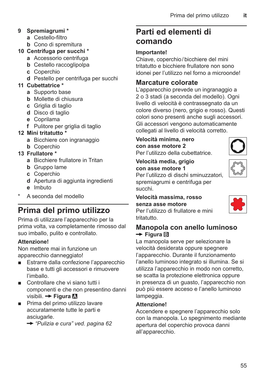 Osservare la marcatura (.). 9. Ruotare il coperchio in senso orario fino all’arresto. Il nasello del coperchio deve entrare nella fessura dell’impugnatura della ciotola fino all’arresto. 10. Inserire la spina di alimentazione. Ruotare la manopola sulla velocità desiderata.
