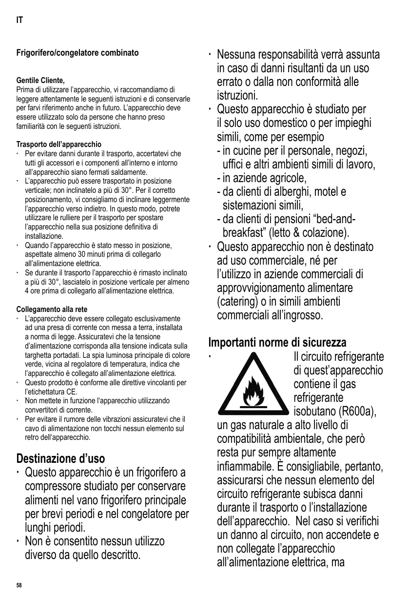 ∙ Cet appareil est destiné à être utilisé dans des applications domestiques et analogues telles que : - des coins cuisines réservés au personnel dans des magasins, bureaux et autres environnements professionnels ; - des fermes ; - l’utilisation par les clients des hôtels, motels et autres environnements à caractère résidentiel ; - des environnements de type chambres d’hôtes. ∙ Cet appareil n’est conçu ni pour un usage commercial ni pour un usage dans la restauration ou environnements similaires. Importantes consignes de sécurité ∙ Le réfrigérant contenu dans le circuit de refroidissement de cet appareil est l’isobutane (R600a), un gaz naturel non polluant, mais qui est, cependant, inflammable. Par conséquent, évitez d’endommager les composants du système de refroidissement pendant le transport et l’installation de l’appareil. Si, toutefois, le circuit de refroidissement s’avère endommagé, ne pas mettre en marche l’appareil et ne pas le connecter au secteur. Si une flamme ou autre source d’allumage se