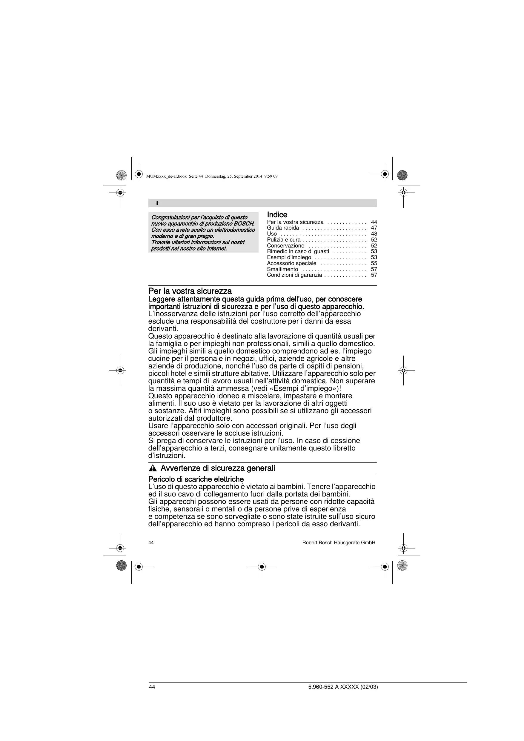 bezüglich des sicheren Gebrauchs des Gerätes unterwiesen wurden und die daraus resultierenden Gefahren verstanden haben. Kinder dürfen nicht mit dem Gerät spielen. Gerät nicht ohne Aufsicht betreiben. Gerät nur gemäß Angaben auf dem Typenschild anschließen und betreiben. Nur zur Verwendung in geschlossenen Räumen. Durchlaufschnitzler nur bei Stillstand des Antriebes und bei gezogenem Netzstecker aufsetzen/abnehmen. Nicht in den Einfüllschacht greifen. Während des Betriebes nie in die Schüssel greifen. Nur mit aufgesetztem Deckel (12) arbeiten! Um bei einer Überlastung des Durchlaufschnitzlers größere Schäden an Congratulations on the purchase of your new BOSCH appliance. In doing so, you have opted for a modern, high-quality domestic appliance. You can find further information about our products on our web page. Connect and operate the appliance only in accordance with the specifications on the rating plate. Only use indoors. Do not use the appliance if the power cord and/or appliance are damaged. Before replacing accessories or additional parts, which move during operation, switch off the appliance and disconnect from the power supply. Always disconnect the appliance from the supply if it is left unattended and before assembling, disassembling or cleaning. Do not place the power cord over sharp edges or hot surfaces. This appliance is identified according to the European guideline 2012/19/EU on waste electrical and electronic equipment – WEEE. Vous venez ainsi d’opter pour un appareil électroménager moderne et de haute qualité. Sur notre site Web, vous trouverez des informations avancées sur nos produits.