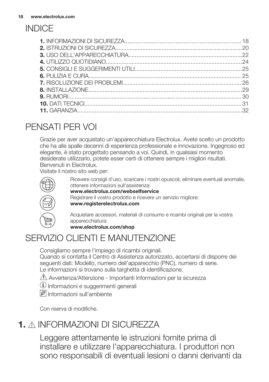 INDICE 1. INFORMAZIONI DI SICUREZZA 18 2. ISTRUZIONI DI SICUREZZA20 3. USO DELL'APPARECCHIATURA22 4. UTILIZZO QUOTIDIANO24 5. CONSIGLI E SUGGERIMENTI UTILI25 6. PULIZIA E CURA 25 7. RISOLUZIONE DEI PROBLEMI 26 8. INSTALLAZIONE29 9. RUMORI 30 10. DATI TECNICI 31 11. GARANZIA32
