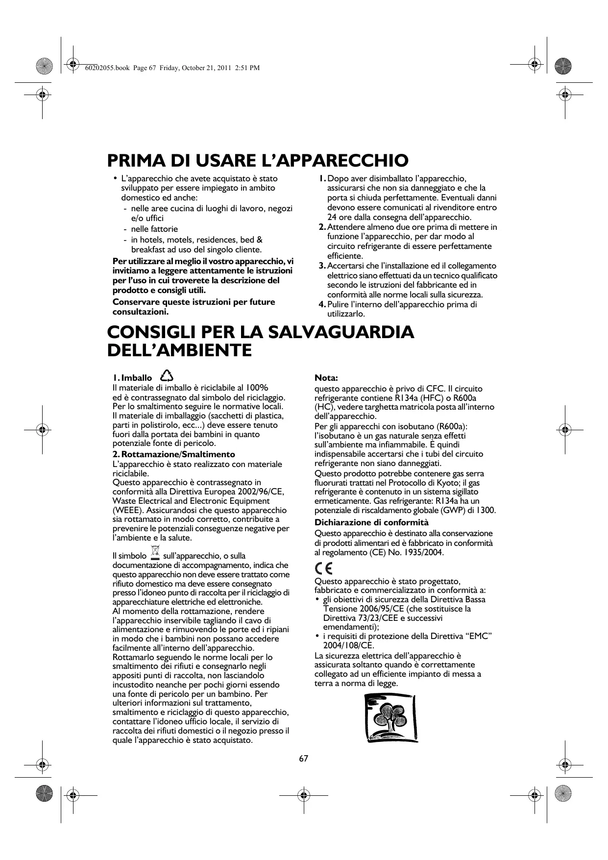 L’apparecchio è stato realizzato con materiale riciclabile. Questo apparecchio è contrassegnato in conformità alla Direttiva Europea 2002/96/CE, Waste Electrical and Electronic Equipment (WEEE). Assicurandosi che questo apparecchio sia rottamato in modo corretto, contribuite a prevenire le potenziali conseguenze negative per l’ambiente e la salute. Nota: questo apparecchio è privo di CFC. Il circuito refrigerante contiene R134a (HFC) o R600a (HC), vedere targhetta matricola posta all’interno dell’apparecchio. Per gli apparecchi con isobutano (R600a): l’isobutano è un gas naturale senza effetti sull’ambiente ma infiammabile. È quindi indispensabile accertarsi che i tubi del circuito refrigerante non siano danneggiati. Questo prodotto potrebbe contenere gas serra fluorurati trattati nel Protocollo di Kyoto; il gas refrigerante è contenuto in un sistema sigillato ermeticamente. Gas refrigerante: R134a ha un potenziale di riscaldamento globale (GWP) di 1300. Dichiarazione di conformità Questo apparecchio è destinato alla conservazione di prodotti alimentari ed è fabbricato in conformità al regolamento (CE) No. 1935/2004. Il simbolo sull’apparecchio, o sulla documentazione di accompagnamento, indica che questo apparecchio non deve essere trattato come rifiuto domestico ma deve essere consegnato presso l’idoneo punto di raccolta per il riciclaggio di apparecchiature elettriche ed elettroniche. Al momento della rottamazione, rendere l’apparecchio inservibile tagliando il cavo di alimentazione e rimuovendo le porte ed i ripiani in modo che i bambini non possano accedere facilmente all’interno dell’apparecchio. Rottamarlo seguendo le norme locali per lo smaltimento dei rifiuti e consegnarlo negli appositi punti di raccolta, non lasciandolo incustodito neanche per pochi giorni essendo una fonte di pericolo per un bambino. Per ulteriori informazioni sul trattamento, smaltimento e riciclaggio di questo apparecchio, contattare l’idoneo ufficio locale, il servizio di raccolta dei rifiuti domestici o il negozio presso il quale l’apparecchio è stato acquistato. Questo apparecchio è stato progettato, fabbricato e commercializzato in conformità a: