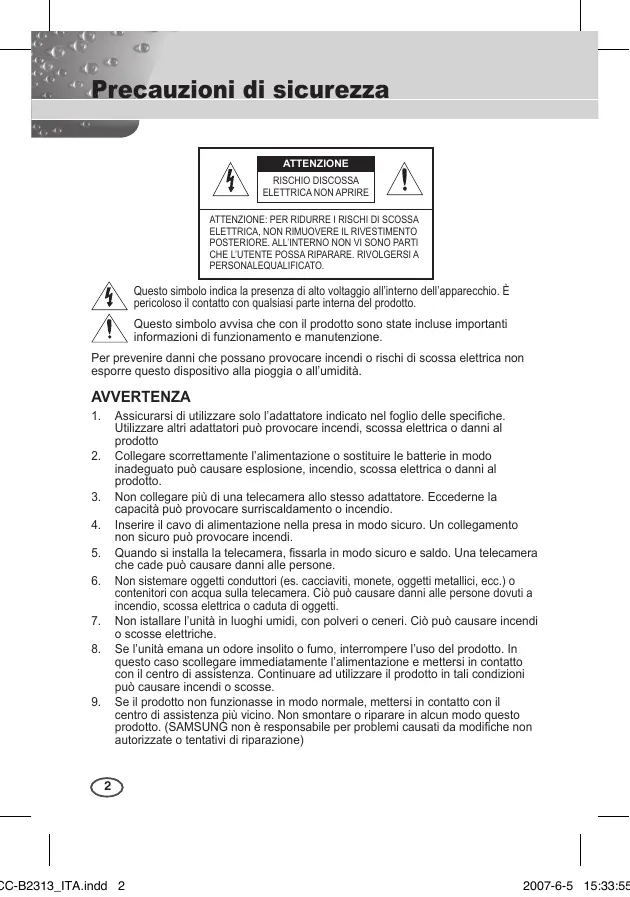 Assicurarsi di utilizzare solo l’adattatore indicato nel foglio delle specifiche. Utilizzare altri adattatori può provocare incendi, scossa elettrica o danni al prodotto Collegare scorrettamente l’alimentazione o sostituire le batterie in modo inadeguato può causare esplosione, incendio, scossa elettrica o danni al prodotto. Non collegare più di una telecamera allo stesso adattatore. Eccederne la capacità può provocare surriscaldamento o incendio. Inserire il cavo di alimentazione nella presa in modo sicuro. Un collegamento non sicuro può provocare incendi. Quando si installa la telecamera, fissarla in modo sicuro e saldo. Una telecamera che cade può causare danni alle persone. Non sistemare oggetti conduttori (es. cacciaviti, monete, oggetti metallici, ecc.) o contenitori con acqua sulla telecamera. Ciò può causare danni alle persone dovuti a incendio, scossa elettrica o caduta di oggetti. Non istallare l’unità in luoghi umidi, con polveri o ceneri. Ciò può causare incendi o scosse elettriche. Se l’unità emana un odore insolito o fumo, interrompere l’uso del prodotto. In questo caso scollegare immediatamente l’alimentazione e mettersi in contatto con il centro di assistenza. Continuare ad utilizzare il prodotto in tali condizioni può causare incendi o scosse. Se il prodotto non funzionasse in modo normale, mettersi in contatto con il centro di assistenza più vicino. Non smontare o riparare in alcun modo questo prodotto. (SAMSUNG non è responsabile per problemi causati da modifiche non autorizzate o tentativi di riparazione)