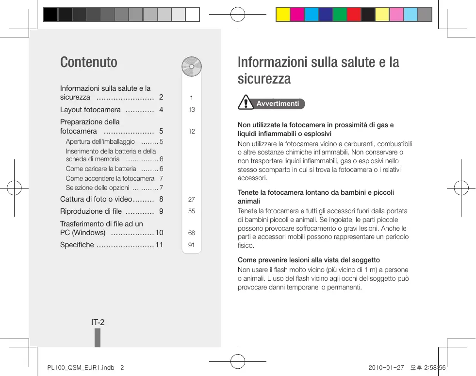 Avvertimenti Non utilizzate la fotocamera in prossimità di gas e liquidi infiammabili o esplosivi Non utilizzare la fotocamera vicino a carburanti, combustibili o altre sostanze chimiche infiammabili. Non conservare o non trasportare liquidi infiammabili, gas o esplosivi nello stesso scomparto in cui si trova la fotocamera o i relativi accessori. Tenete la fotocamera lontano da bambini e piccoli animali Tenete la fotocamera e tutti gli accessori fuori dalla portata di bambini piccoli e animali. Se ingoiate, le parti piccole possono provocare soffocamento o gravi lesioni. Anche le parti e accessori mobili possono rappresentare un pericolo fisico. Come prevenire lesioni alla vista del soggetto Non usare il flash molto vicino (più vicino di 1 m) a persone o animali. L'uso del flash vicino agli occhi del soggetto può provocare danni temporanei o permanenti. IT-2 PL100_QSM_EUR1.indb 2 2010-01-27 오후 2:58:56 Maneggiate e smaltite con cura le batterie e i caricabatterie
