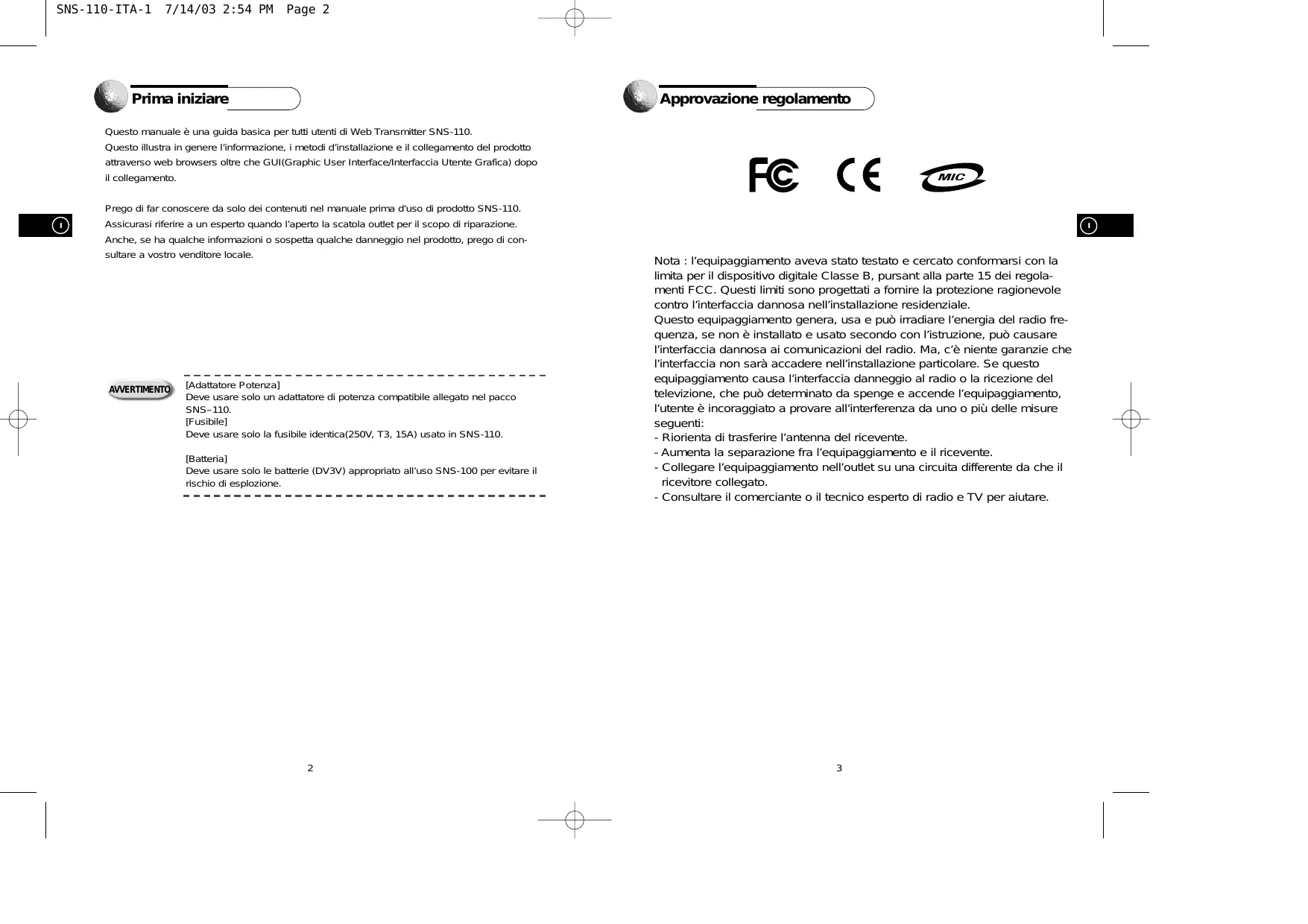 SNS-110-ITA-1 7/14/03 2:54 PM Page 2 Prima iniziare Approvazione regolamento Questo manuale è una guida basica per tutti utenti di Web Transmitter SNS-110. Questo illustra in genere l’informazione, i metodi d’installazione e il collegamento del prodotto attraverso web browsers oltre che GUI(Graphic User Interface/Interfaccia Utente Grafica) dopo il collegamento.