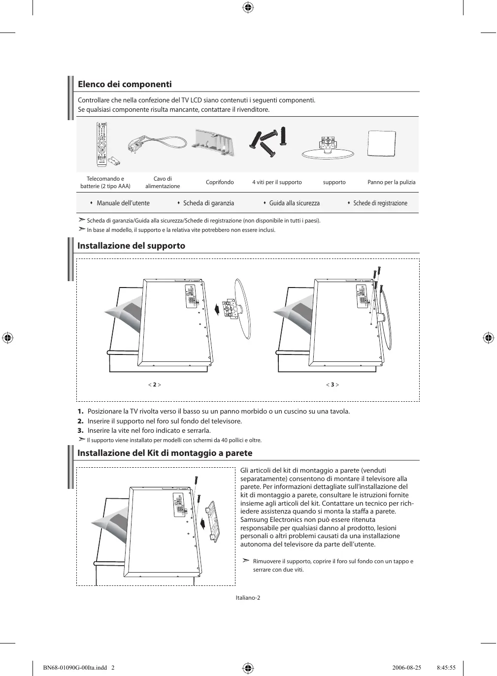 - Diagrammi a blocchi Questo apparecchio è fabbricato in conformità al D.M.28.08.95 n.548 ed in particolare a quanto specificato nell Art.2, comma 1. Questo apparecchio è fabbricato nella U.E. in conformità al D.M.28.08.95 n.548 Art.2, comma 1 ed al D.M.26.03.92 Art.1 Simboli Premere Importante Nota Italiano-1 BN68-01090G-00Ita.indd 1 2006-08-25 Italiano Tasto One-Touch 8:45:48 Elenco dei componenti Controllare che nella confezione del TV LCD siano contenuti i seguenti componenti. Se qualsiasi componente risulta mancante, contattare il rivenditore. Telecomando e batterie (2 tipo AAA) Cavo di alimentazione Manuale dell’utente Coprifondo 4 viti per il supporto Scheda di garanzia supporto Guida alla sicurezza Panno per la pulizia Schede di registrazione Scheda di garanzia/Guida alla sicurezza/Schede di registrazione (non disponibile in tutti i paesi). In base al modello, il supporto e la relativa vite potrebbero non essere inclusi. Installazione del supporto <2> <3> p. 46