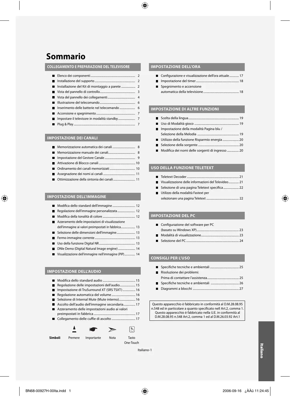 - Diagrammi a blocchi Questo apparecchio è fabbricato in conformità al D.M.28.08.95 n.548 ed in particolare a quanto specificato nell Art.2, comma 1. Questo apparecchio è fabbricato nella U.E. in conformità al D.M.28.08.95 n.548 Art.2, comma 1 ed al D.M.26.03.92 Art.1 Italiano-1 BN68-00927H-00Ita.indd 1 Italiano Tasto One-Touch 2006-09-16 ¿ÀÀü 11:24:45 Elenco dei componenti Controllare che nella confezione del TV LCD siano contenuti i seguenti componenti. Se qualsiasi componente risulta mancante, contattare il rivenditore. M4 X L16 Telecomando e batterie (2 tipo AAA) Cavo di alimentazione Manuale dell’utente Coprifondo 4 viti per il supporto Scheda di garanzia supporto Guida alla sicurezza Panno per la pulizia Schede di registrazione Scheda di garanzia/Scheda di garanzia/Guida alla sicurezza (non disponibile in tutti i paesi). Installazione del supporto <2> <3> p. 27