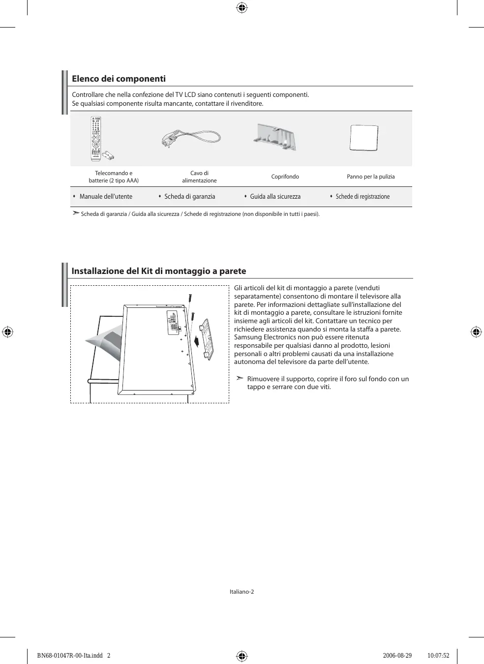 Configurazione e visualizzazione dell’ora attuale ............. 19 Impostazione del timer .......................................................... 20 Spegnimento e accensione automatica del televisore ...................................................... 20 Questo apparecchio è fabbricato in conformità al D.M.28.08.95 n.548 ed in particolare a quanto specificato nell Art.2, comma 1. Questo apparecchio è fabbricato nella U.E. in conformità al D.M.28.08.95 n.548 Art.2, comma 1 ed al D.M.26.03.92 Art.1 Simboli Premere Importante Nota Italiano-1 BN68-01047R-00-Ita.indd 1 2006-08-29 Italiano Tasto One-Touch 10:07:44 Elenco dei componenti Controllare che nella confezione del TV LCD siano contenuti i seguenti componenti. Se qualsiasi componente risulta mancante, contattare il rivenditore. Telecomando e batterie (2 tipo AAA) Manuale dell’utente Cavo di alimentazione Coprifondo Scheda di garanzia Guida alla sicurezza Panno per la pulizia Schede di registrazione Scheda di garanzia / Guida alla sicurezza / Schede di registrazione (non disponibile in tutti i paesi). Installazione del Kit di montaggio a parete Gli articoli del kit di montaggio a parete (venduti separatamente) consentono di montare il televisore alla parete. Per informazioni dettagliate sull’installazione del kit di montaggio a parete, consultare le istruzioni fornite insieme agli articoli del kit. Contattare un tecnico per richiedere assistenza quando si monta la staffa a parete. Samsung Electronics non può essere ritenuta responsabile per qualsiasi danno al prodotto, lesioni personali o altri problemi causati da una installazione autonoma del televisore da parte dell’utente. Rimuovere il supporto, coprire il foro sul fondo con un tappo e serrare con due viti. Italiano-2 BN68-01047R-00-Ita.indd 2 2006-08-29 10:07:52 Vista del pannello di controllo La forma e il colore del prodotto possono variare in base al modello. SOURCE Passa tra tutte le sorgenti di ingresso disponibili (TV, Est.1, Est.2, AV, S-Video, Comp., PC, HDMI1, HDMI2). Nel menu a video, utilizzare questo tasto così come si usa il tasto ENTER del telecomando. MENU Premere per visualizzare il menu su schermo con le funzioni del televisore. Altoparlanti (Alimentazione) Premere per accendere e spegnere il televisore. Indicatore alimentazione Lampeggia e si spegne quando l’alimentazione è attivata e si accende in modalità stand-by. Sensore telecomando Puntare il telecomando verso questo punto del televisore. Premere per aumentare o diminuire il volume. così come Nel menu a video, utilizzare i tasti si usano i tasti e del telecomando. Premere per cambiare canale. così Nel menu a video, utilizzare i tasti come si usano i tasti e del telecomando. (Senza il telecomando, si può accendere il televisore utilizzando i tasti canale.) Italiano-3 BN68-01047R-00-Ita.indd 3 2006-08-29 10:07:52 Vista del pannello dei collegamenti [Jack pannello laterale] [Jack pannello posteriore] Ingresso alimentazione Quando si collega un dispositivo esterno al televisore, assicurarsi che l’alimentazione dell’unità sia scollegata. Quando si collega un terminale esterno, far corrispondere il colore del terminale di collegamento a quello del cavo. Italiano-4 BN68-01047R-00-Ita.indd 4 2006-08-29 10:07:53 Collegamento di un’antenna o di una rete televisiva via cavo Per vedere correttamente i canali televisivi, il monitor TV deve ricevere un segnale da una delle seguenti fonti: - Un’antenna all’esterno / Una rete televisiva via cavo / Una rete satellitare Collegamento di HDMI/DVI - Supporta le connessioni tra periferiche AV con connessione HDMI (set top box, lettori DVD, ricevitori AV e televisori digitali). - Non è necessario un ulteriore collegamento audio per la connessione HDMI-HDMI. Che cosa significa HDMI? - “High Definition Multimedia Interface” permette la trasmissione di dati video digitali ad alta definizione e audio digitale a canali multipli (5.1 canali). - Il terminale HDMI/DVI supporta il collegamento a una periferica estesa con un cavo appropriato (non fornito). La differenza tra HDMI e DVI è che il dispositivo HDMI è di dimensioni inferiori, ha la funzione di codifica HDCP (High Bandwidth Digital Copy Protection) installata, e supporta audio digitale a canali multipli. Utilizzare il cavo DVI-HDMI o una prolunga DVI-HDMI per il collegamento e il terminale “R - AUDIO – L” su DVI per l’uscita audio. - Quando si collega questo prodotto attraverso HDMI o DVI a un Set Top Box, un lettore DVD, una console di gioco ecc., verificare che sia stato impostato a una modalità di uscita video compatibile come mostrato nella tabella sottostante. In caso contrario, possono verificarsi distorsioni, interruzioni o assenza di immagine. Modalità supportate per DVI o HDMI 50 Hz 60 Hz Comp. 480i