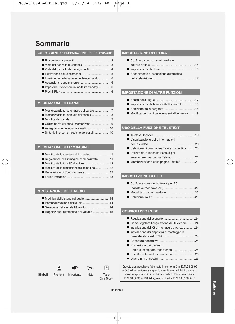 - Come regolare l'angolazione del televisore p. 24