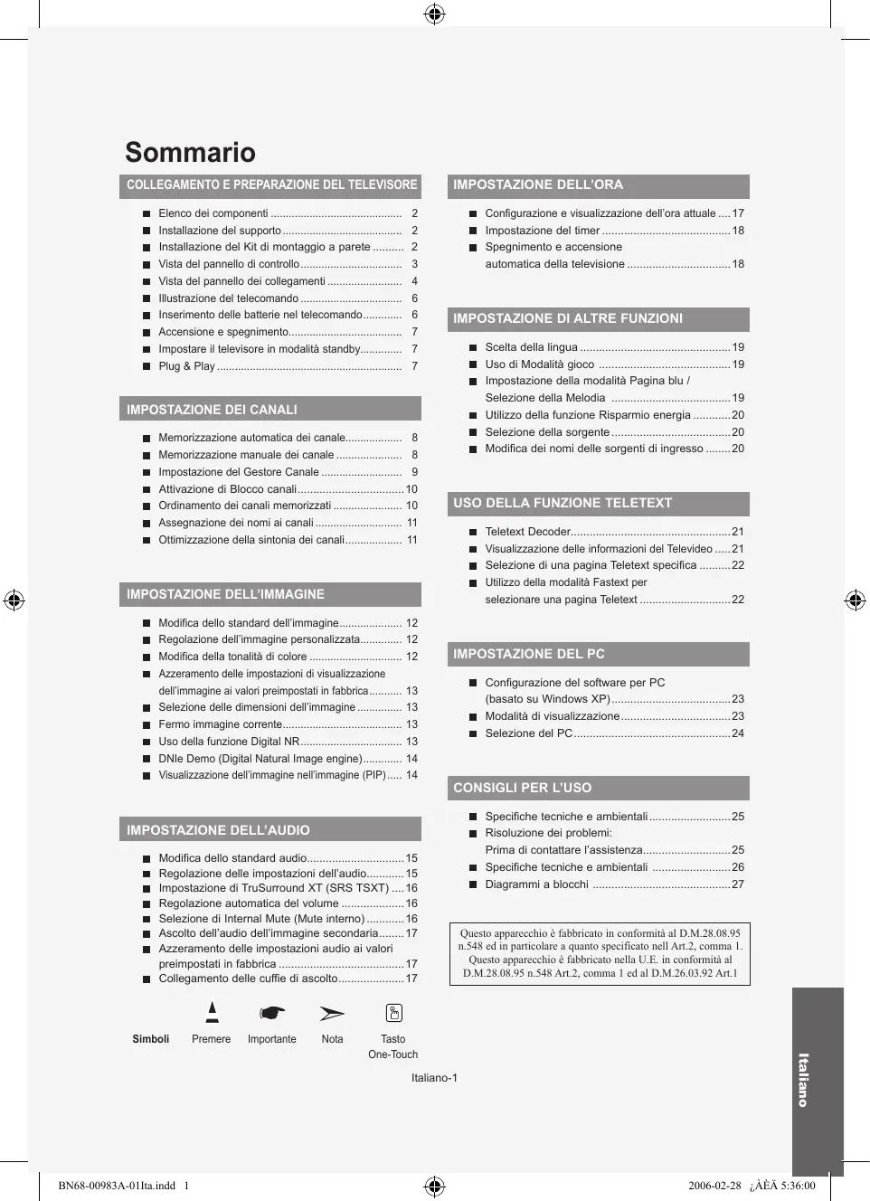 - Questo apparecchio è fabbricato in conformità al D.M.28.08.95 n.548 ed in particolare a quanto specificato nell Art.2, comma 1. Questo apparecchio è fabbricato nella U.E. in conformità al D.M.28.08.95 n.548 Art.2, comma 1 ed al D.M.26.03.92 Art.1 Italiano Tasto One-Touch Italiano- BN68-00983A-01Ita.indd 1 Teletext Decoder p. 21